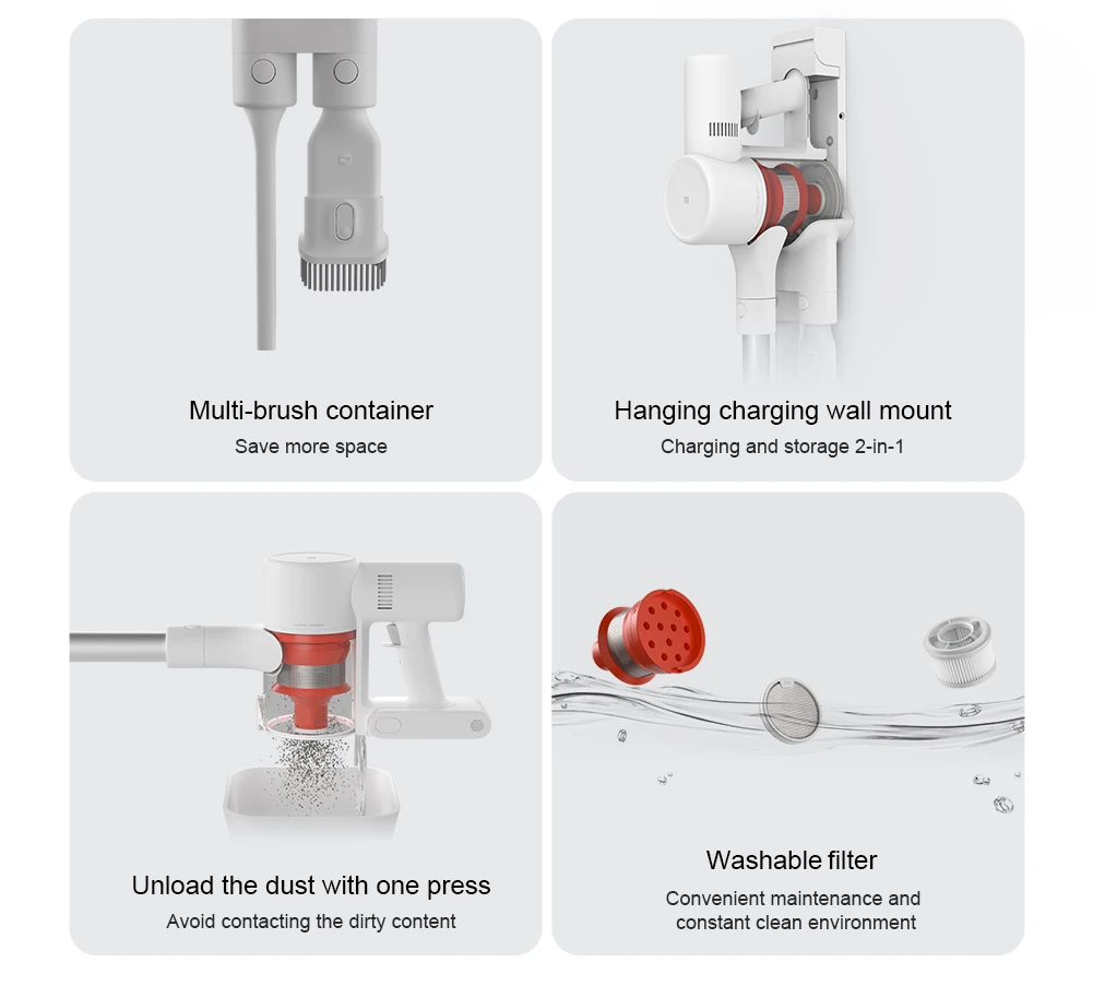 Оснащенный высокоскоростным бесщеточным двигателем 100000 об/мин, который генерирует мощность до 120AWsuction, пылесос может эффективно удалять различные скрытые грязи dustand на различных видах полов. Домашняя работа больше не является трудоемкой с помощью этого высокоэффективного пылесоса.