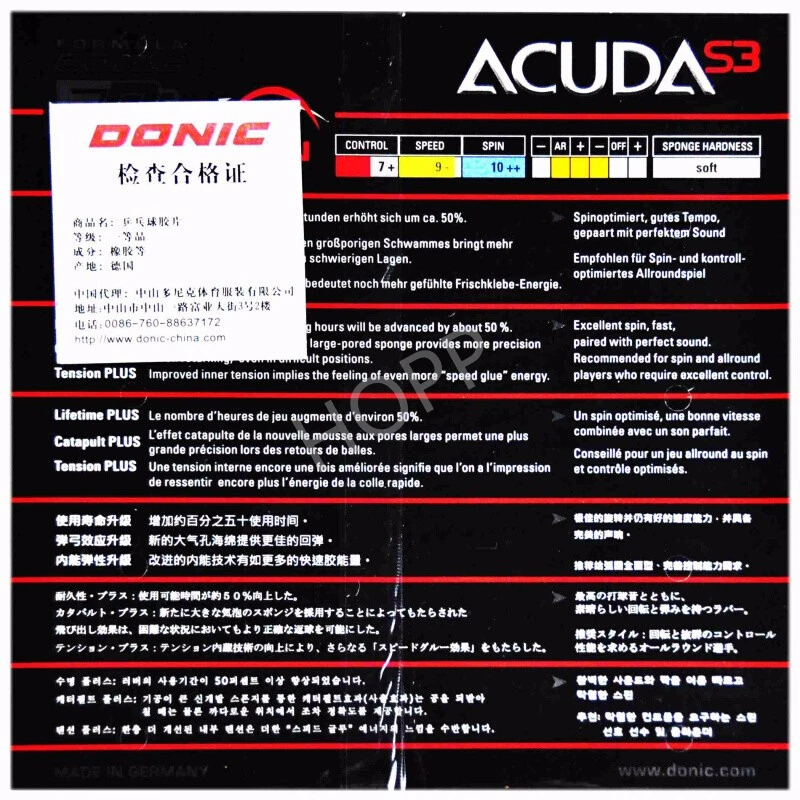 Резина DONIC ACUDA S3 для настольного тенниса, сделано в Германии, крутящиеся все прыщи с губкой для пинг-понга tenis de mesa
