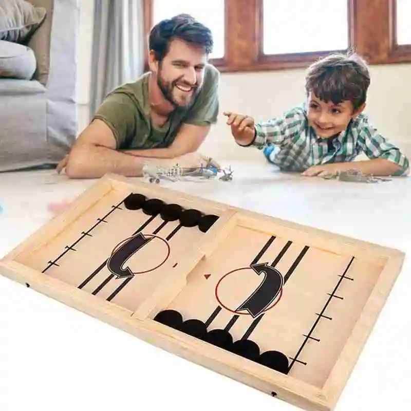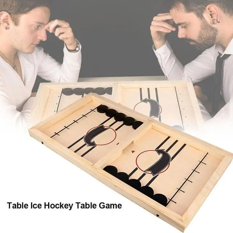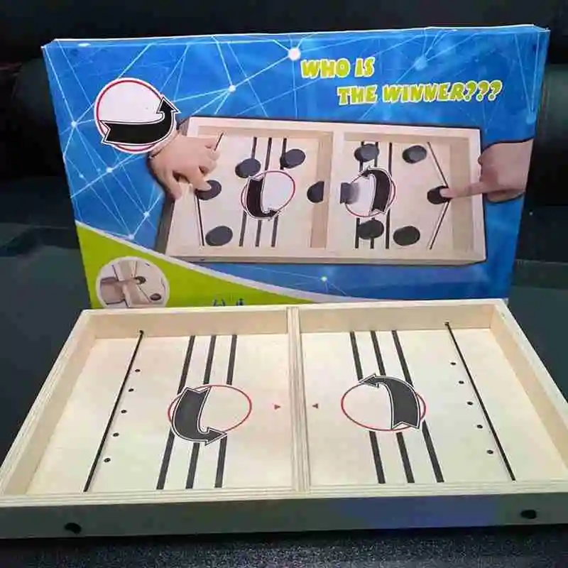 2. Начните игру и разместите пять шайб на каждой стороне доски. Вставьте оба конца эластичной ленты в боковые пазы, чтобы они встали на место. Два игрока аплодировали стилю «High Ten», чтобы начать игру.