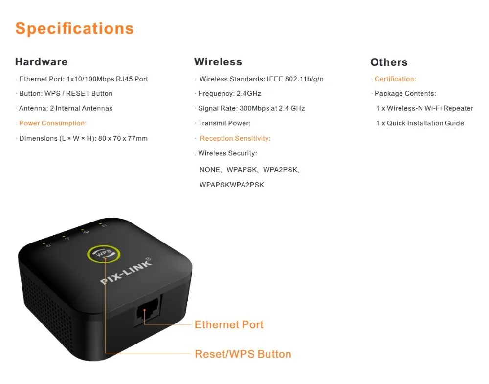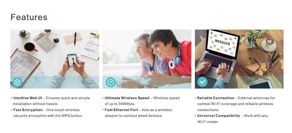 Сильная Совместимость: Работает с любым стандартным маршрутизатором. Поддержка 802.11b/g/n Wi-Fi устройств и 2,4 ГГц сигнала
