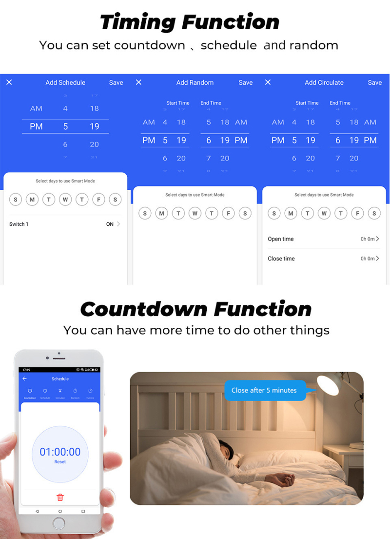 Переключатель, время, обратный отсчет и другие функции устройства через Мобильный телефон 2. Голосовое управление. Поддержка голосовых помощников, таких как Tmall Wizard, Alexa, GoolHome и т. д. для реализации таких функций, как Переключатели;