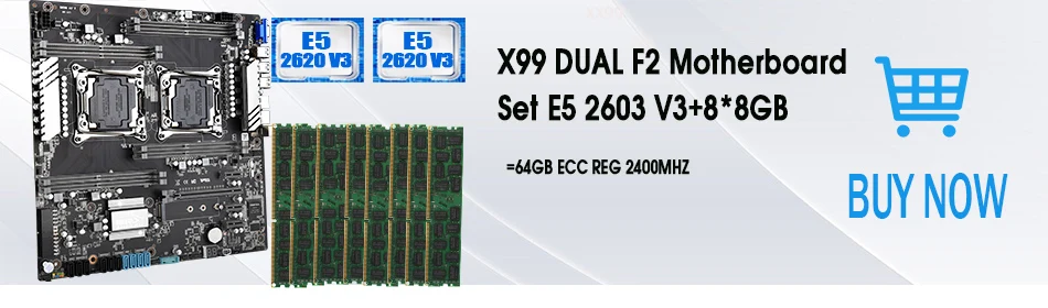 Наша посылка включает в себя 1 шт. X99 двойная материнская плата F2, 8 шт. 8 Гб ddr4 2400 МГц ECC REG RAM,2 шт. E5 2620 V3 CPU