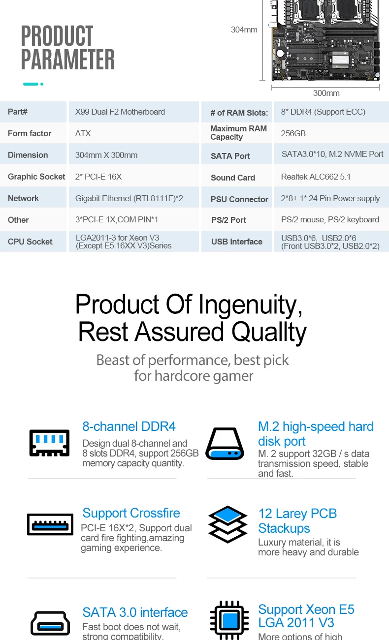Примечание:Jingsha X99 двойной F2 материнская плата LGA 2011 E5 2603V3 E5-2630V3 E5-2640V3 E5-2650V3 E5-2660V3 E5-2670V3 E5-2673V3 E5-2676V3 E5-2678V3 E5-2620V3 8 * DDR4 1600/1866/2133/2400 МГц Оперативная память 10 * SATA 3,0 NVME_M.2 SSD. Не поддерживает ES или QS версию процессора