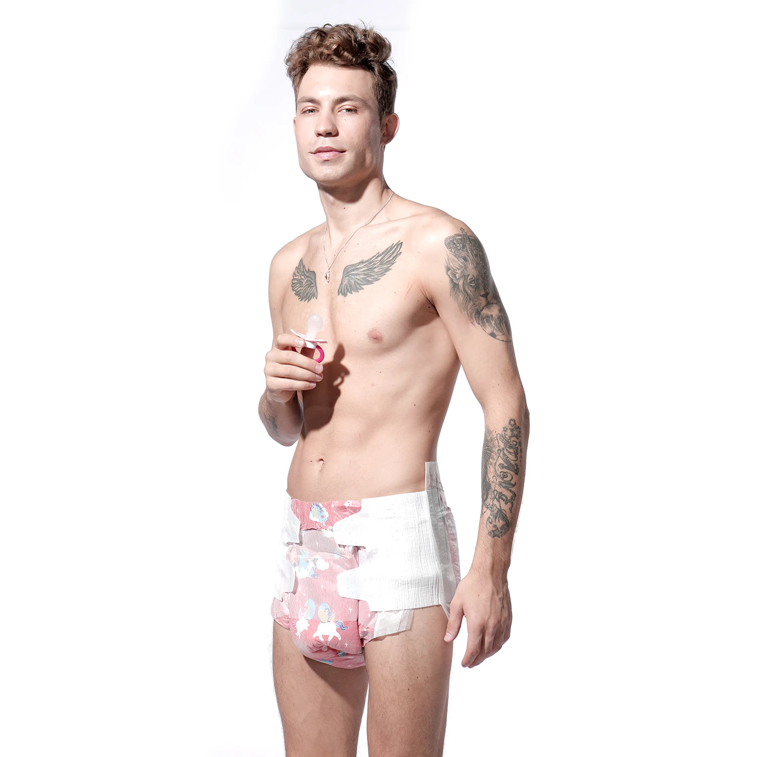 Материал подгузника: Специальный высококачественный материал ABDL подгузник изготовлен из нетканого материала CMT. Этот материал прочнее, чем PPE пластиковый материал, не легко проникает, и цвет печати более яркий