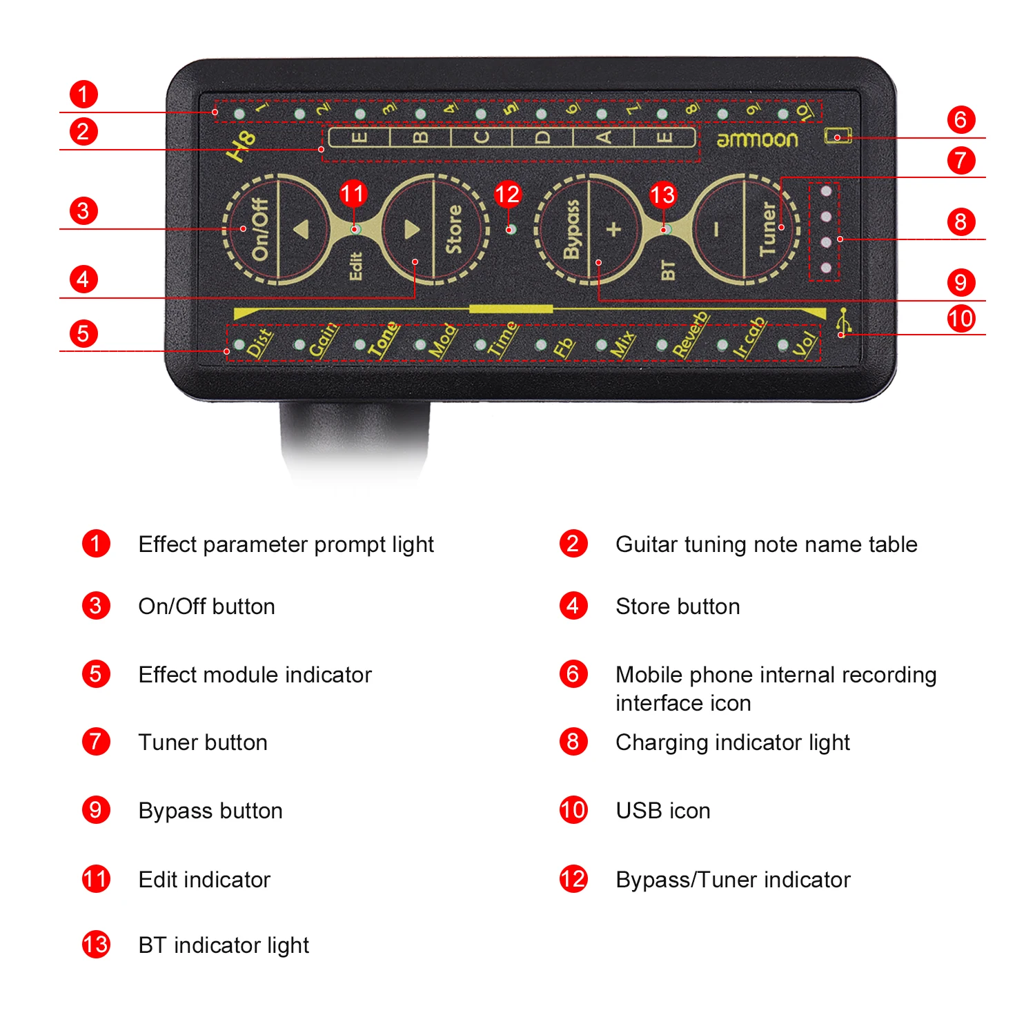 Мульти-эффект-содержит 10 классических предусилителей, два часто используемых модуляционных эффекта хора и фазера, эффект реверберации холла, 10 классических ИК-симуляций шкафа и Высокоточный тюнер.