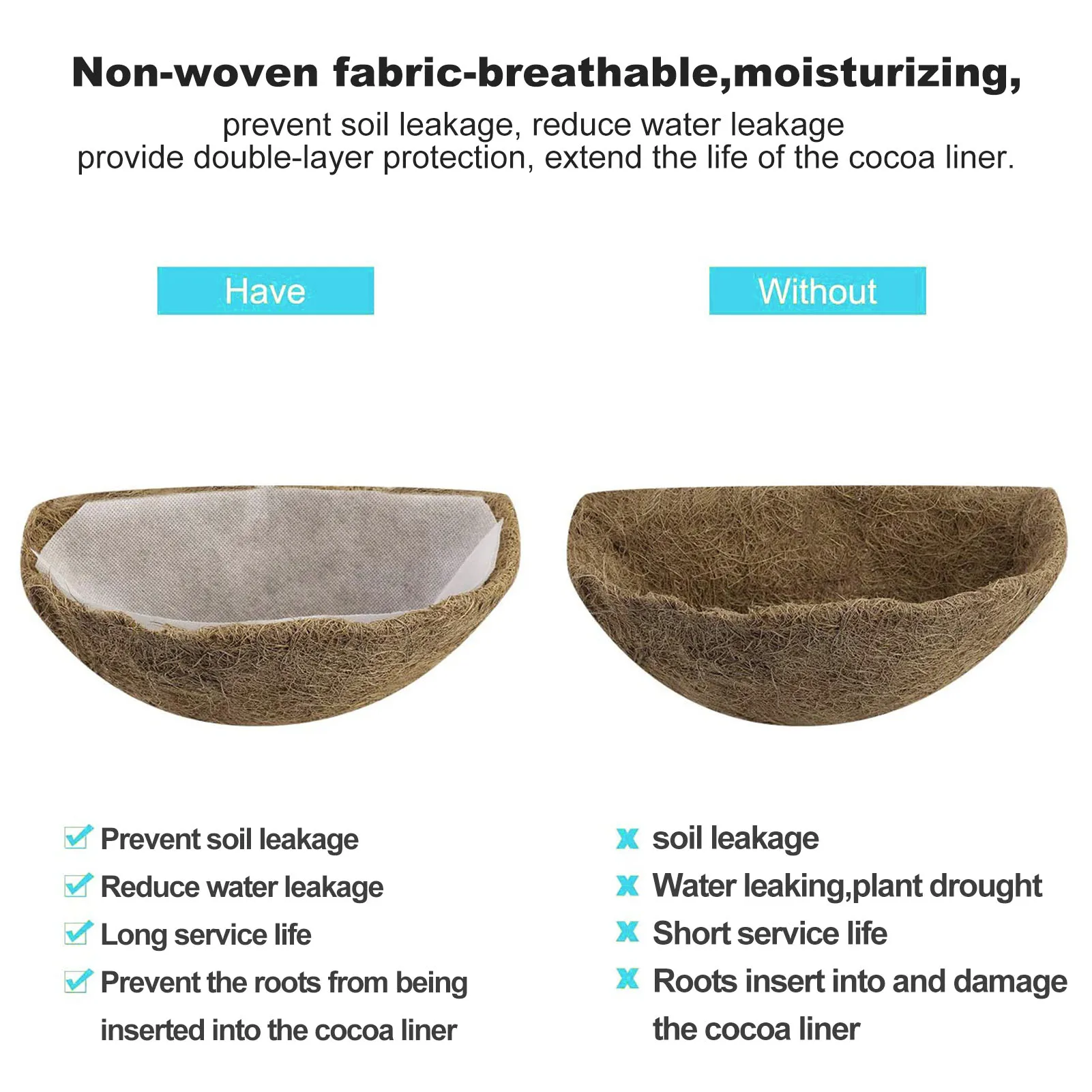 Вы можете получить: 1 подкладка из кокосового волокна и 1 Нетканая подкладка. Он отлично удерживает влагу почвы, поэтому требуется меньше полива, сокращая время полива и экономя время и энергию. Нанесение этой круглой подкладки из какао-волокна в горшок может продлить срок службы горшка, и он может быть идеально использован в вашей висячей корзине. Когда срок службы кокосовый вкладыш истекает, возьмите нетканый вкладыш с почвой и растениями непосредственно из висячей корзины, замените кокосовый вкладыш, а затем положите его на кокосовый вкладыш, что удобно и быстро.Особенности: