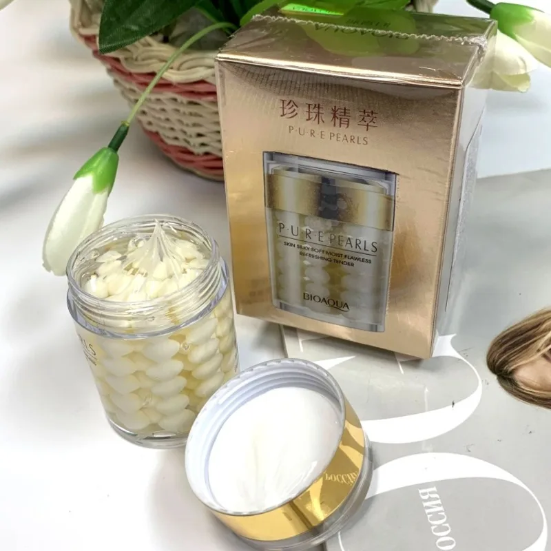 1769436 УВЛАЖНЯЮЩИЙ КРЕМ ДЛЯ ЛИЦА PURE PEARLS (60Г.), BIOAQUA. Арт 4587 Увлажняющий крем для лица Pure Pearls (60г.), BIOAQUA Благодаря особой технологии получения жемчужной эссенции в ней сохраняются аминокислоты, необходимые коже для сохранения красоты и здоровья. В состав эссенции также входят кальций, цинк, магний, витамины. Идеальное средство для подготовки лица к макияжу. Крем словно заполняет морщинки изнутри, визуально выравнивая кожу, придавая лицу отдохнувший, свежий вид. Обладая нежной кремово-гелевой консистенцией, средство отлично распределяется по коже, не оставляет ощущения жирности и липкости. Крем помогает поддерживать нормальный уровень влаги на клеточном уровне. Именно увлажненная кожа выглядит сияющей, здоровой, ровной. Сохранению влаги способствуют входящие в состав средства миндальное и оливковое масла. Почти два десятка микроэлементов, содержащихся в жемчуге, обеспечивают ускорение регенерации кожи. Регулярное применение BioAqua Pure Pearls поможет напитать кожу влагой, витаминами, минералами, поддержать ее тонус, эластичность. Способ применения: Нанести крем на чистую сухую кожу лица и шеи. Небольшое количество средства распределить по коже массирующими и вбивающими движениями. Оставить до полного впитывания. Применять один-два раза в день. 60гр.