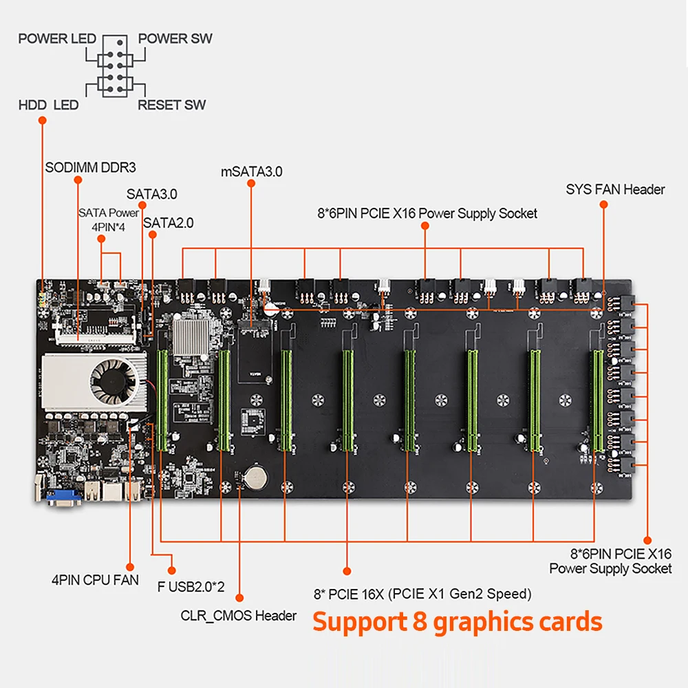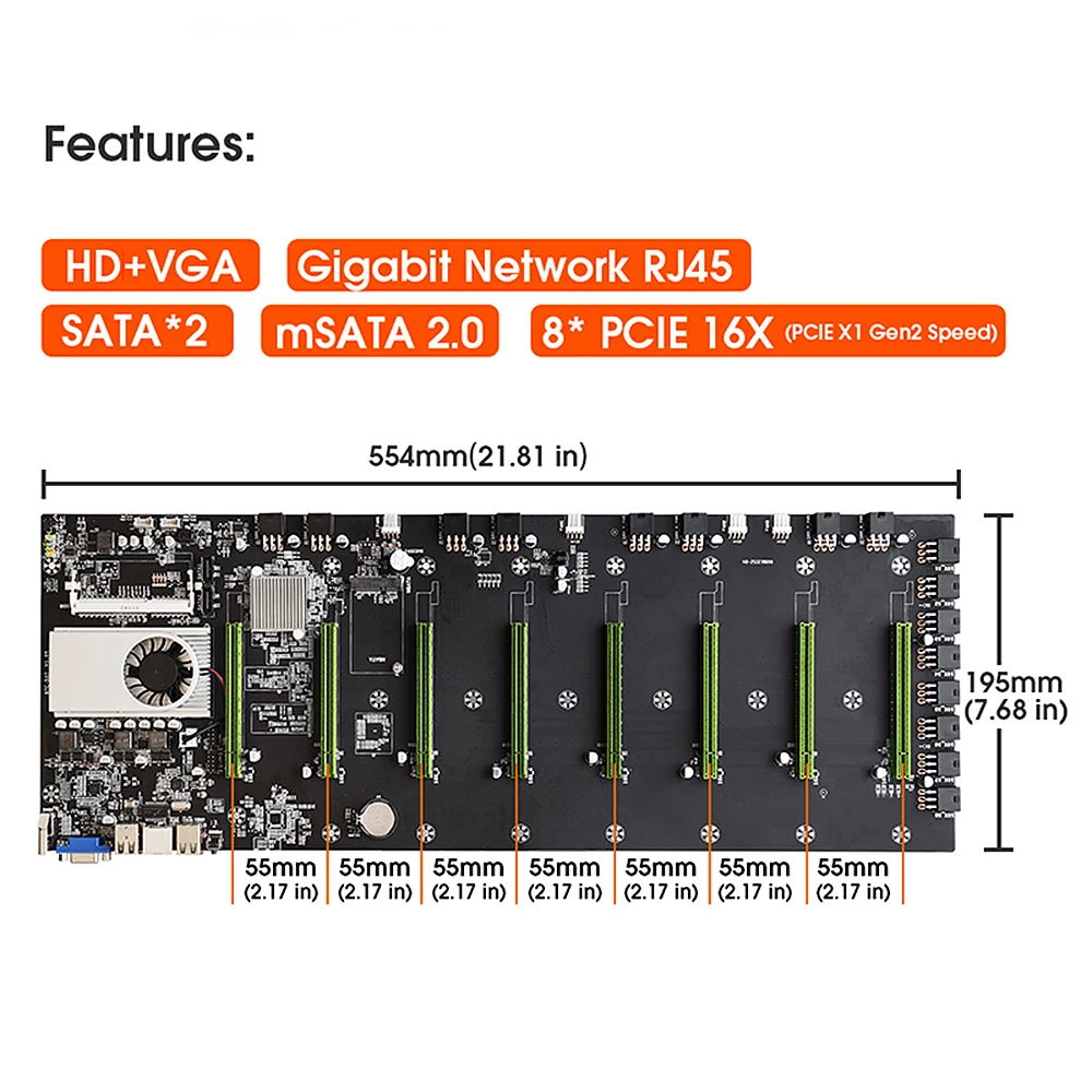 Оснащен 8 слотами PCI-E 16X, поддерживает 8 видеокарт.