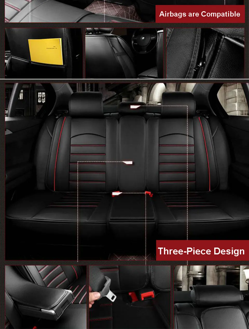 Название: чехол для автомобильного сиденья Модель: SLDZ0045 Материал: из искусственной кожи Подходящая модель автомобиля: Универсальная Цвет: черный/бежевый/черный кофейный/черный красный Особенности: совместимость с подушками безопасности, дышащая, водонепроницаемая. Это универсальный чехол для автомобильных сидений, подходит для моделей автомобилей 99%.