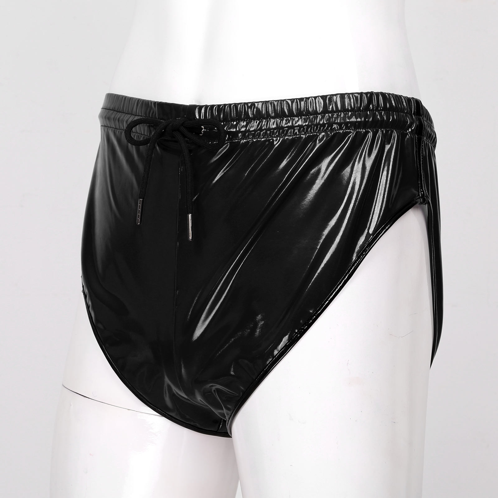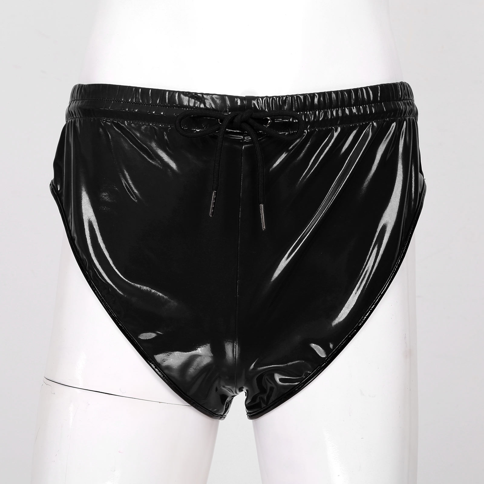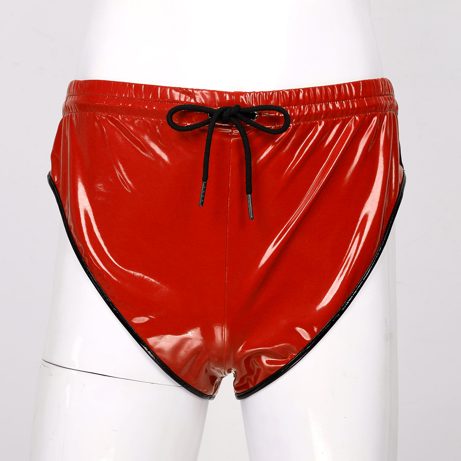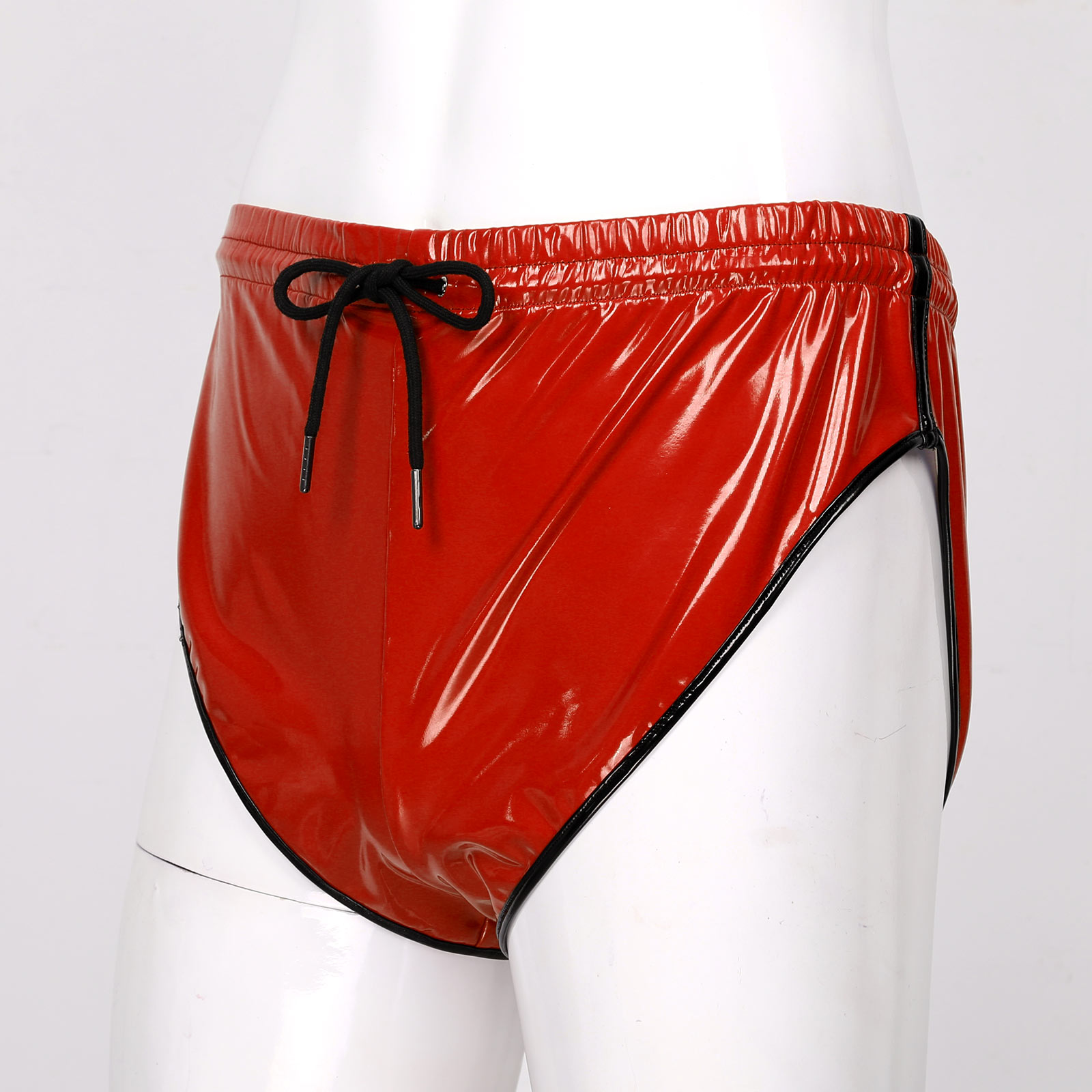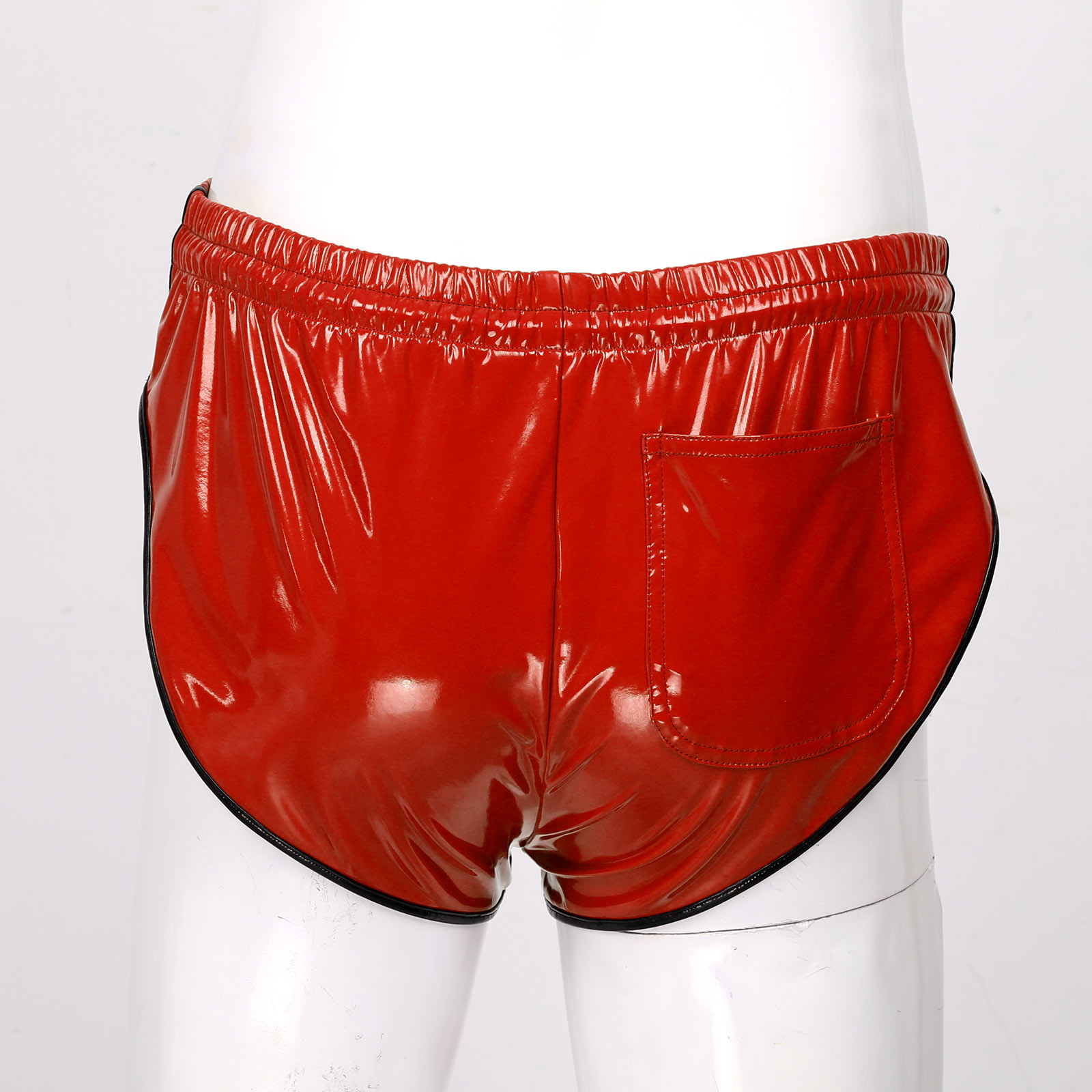 Мужские трусы-шорты из лакированной кожи с эластичным поясом на шнурке и карманом.