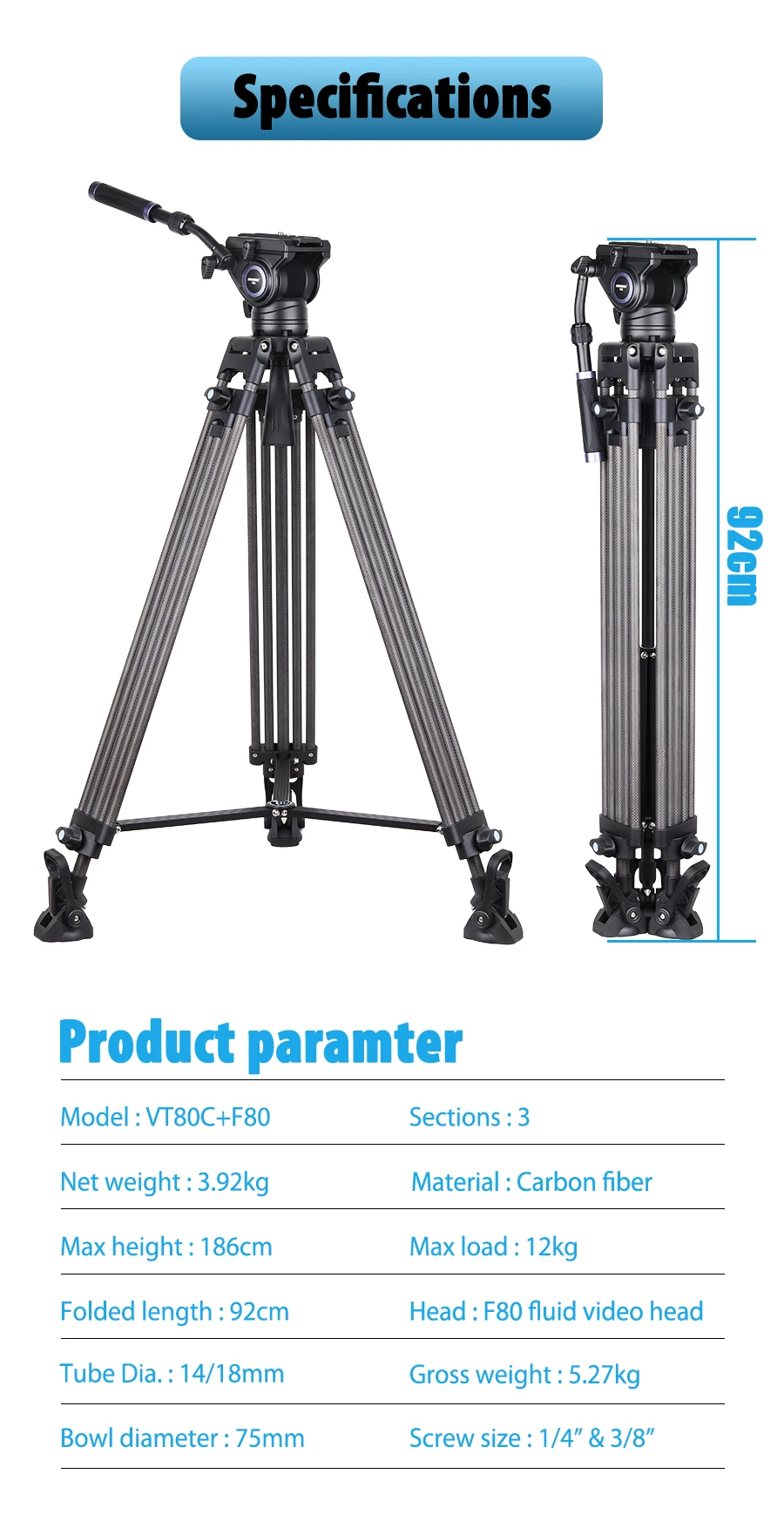 【Высокая Емкость 】 этот видео штатив изготовлен из 5 прочных углеродных трубок, максимальная нагрузка 12 кг, максимальная высота 186 см, подходит для большинства DSLR камер, видеокамер, DV, слайдер видео и т. Д.