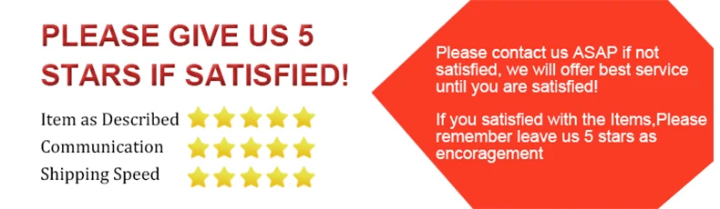 1. Пожалуйста, оставьте отзывы в с 5 звездами. Если вы удовлетворены нашими товарами и обслуживанием, Мы будем признательны (товар соответствует описанию 5 звезд, связь 5 звезд, время доставки 5 звезд).