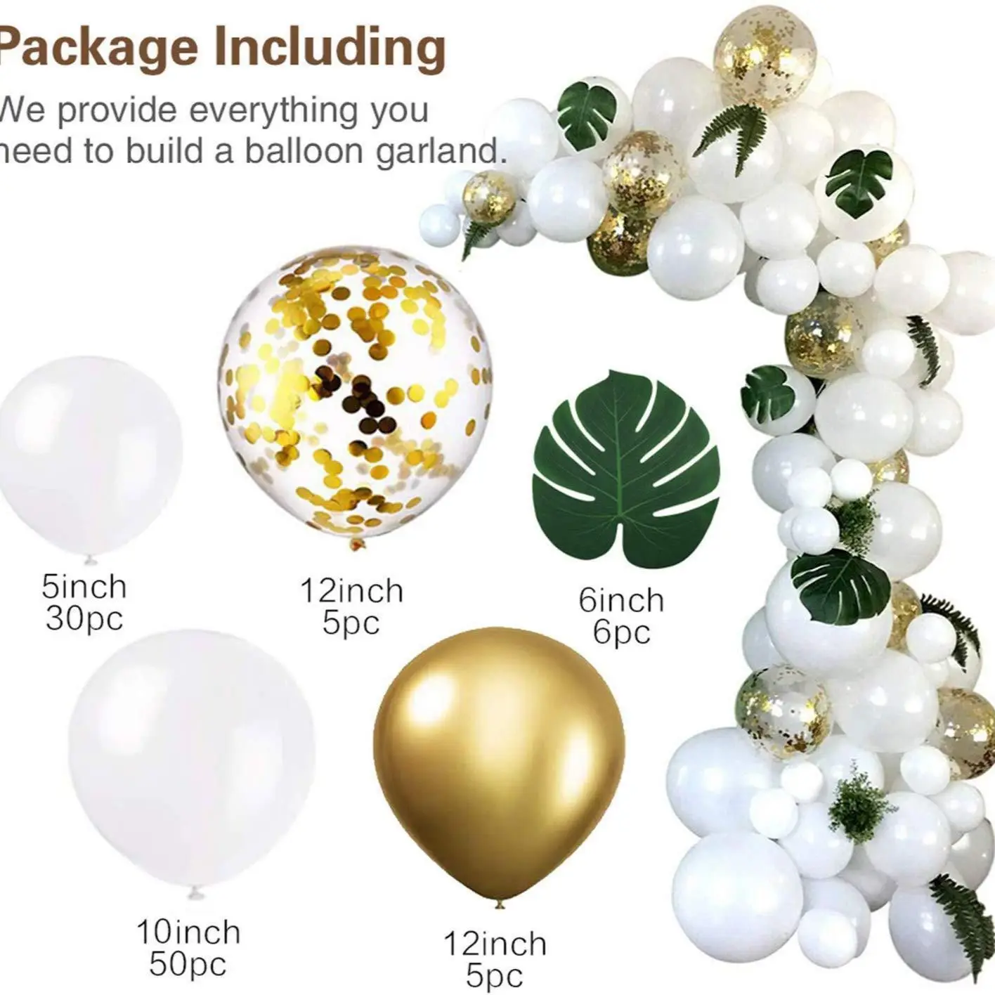 50 шт. 10 дюймов белый шар 30 шт 5 дюймов белый шар 5 шт. 12 дюймов золотой хромированный воздушный шар 5 шт. 12 дюймов золото воздушный шар "Конфетти" 6 шт 6 дюймов искусственные Пальмовые Листья 1 х 5 м длинная пластиковая цепь; 1x100 шт точечный клей.
