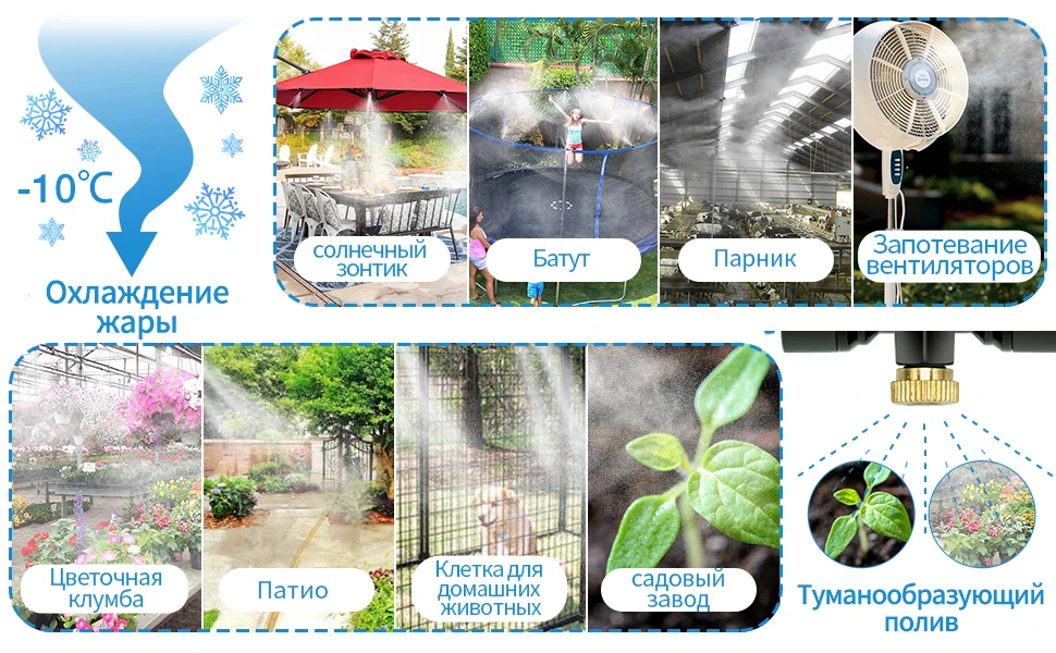 Система запотевания производит водяной туман, который поглощает тепло от окружающего воздуха в жаркое лето, и обеспечивает охлаждение на открытом воздухе, охлаждает окружающую температуру воздуха до 20 ℃ или 68 ℉.