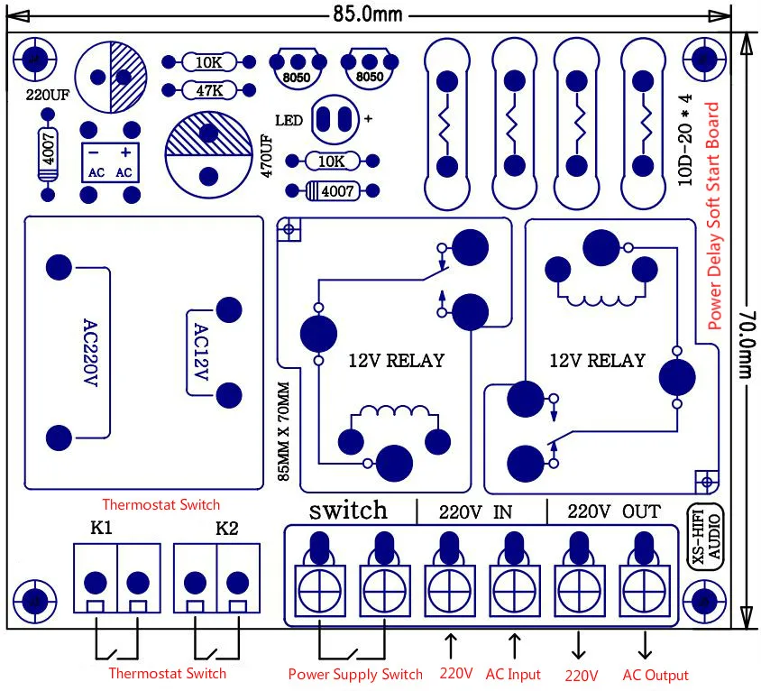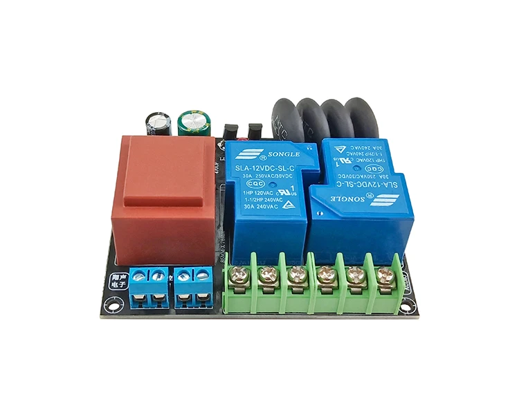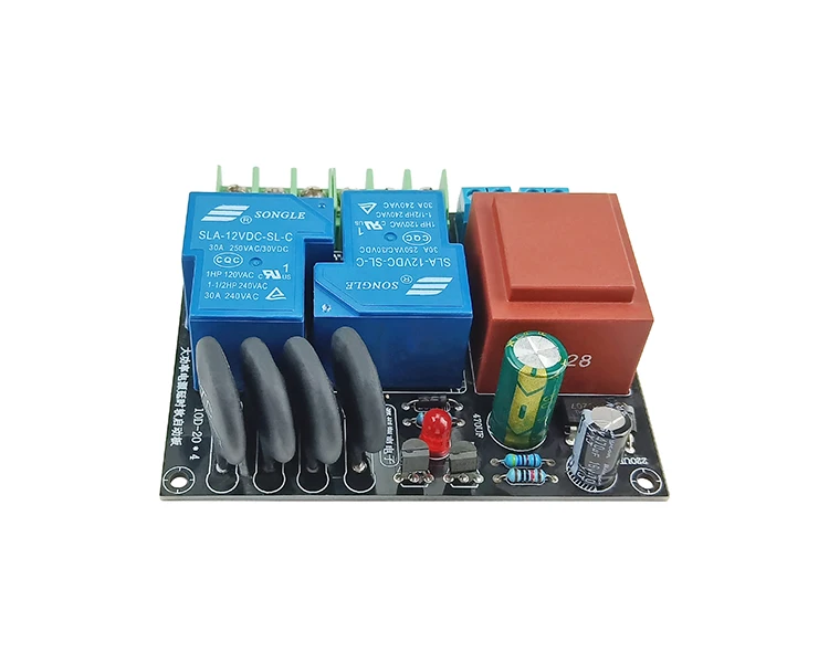 Обзор высокой мощности питания задержка плавного пуска платы: 1. Встроенная промышленная герметичная конструкция блока питания трансформатора, энергопотребление в режиме ожидания-O. 2,2 только 30A реле высокого тока управления, выключатель питания нужен только 10 мА для управления 2000 Вт электрического оборудования. 3,4 термисторы используются в качестве пусковой нагрузки для уменьшения пускового импульсного тока. 4. Цепь задержки является задержкой емкости транзистора, и параметры сопротивления и ёмкости можно отрегулировать, чтобы изменить время задержки. 5. Резерв 2 переключателя контроля температуры. Когда не используется, вам нужно короткое замыкание двух температурных переключателей. 6. Когда светодиодный индикатор загорается, он представляет собой обычный источник питания. Производительность: Рабочее напряжение: 220 В переменного тока. Задержка загрузки: около 3 с (3 секунды). Ограничение пускового тока: около 3.5A. Размер платы: длина 85 мм, ширина 70 мм, высота 28 мм. Вес нетто: 186 г. Категория защиты: снижение напряжения и ограничение тока при запуске. Принцип цепи: Включите питание (режим ожидания с 0 энергопотреблением)-выключатель питания включен-встроенный Трансформатор работает, выпрямленный и фильтрованный выход постоянного тока позволяет реле 1 через температурный переключатель-реле 1 закрыто-шнур задержки включения питания NTC запускается (управление цепи задержки)-Запуск полного короткого замыкания NTC (Реле 2 контролирует выходное напряжение 220 в)-выключение питания трансформатора-выключение реле-общее выключение питания и вход в режим ожидания (0 Потребляемая мощность). В рабочем процессе, если переключатель температуры выключен, реле будет выключено, и после того, как переключатель температуры снова включится, процесс мягкого запуска будет повторен один раз. Примечания: 1. Мягкий Пуск трансформатора + 2 релейная структура имеет преимущество безопасности, о-потребление энергии в режиме ожидания, с использованием трансформаторного источника питания, производительность является более стабильной и надежной, чем конденсатор питания. Недостаток в том, что стоимость высока и занимает место. 2. Выбор переключателя питания требует самоблокирующегося выключателя 220 В переменного тока, а ток больше 10 мА. 3. Два переключателя контроля температуры защищены на плате. Этот переключатель должен быть переключателем температуры с длительным приближением. Напряжение на этой цепи составляет 12 В постоянного тока, а ток-20 мА. Если переключатель температуры не добавлен, два температурных переключателя должны быть короткими. 4. Эта печатная плата подключена к переменному току 220 В, что требует работы профессиональных электриков. Опасность высокого напряжения!