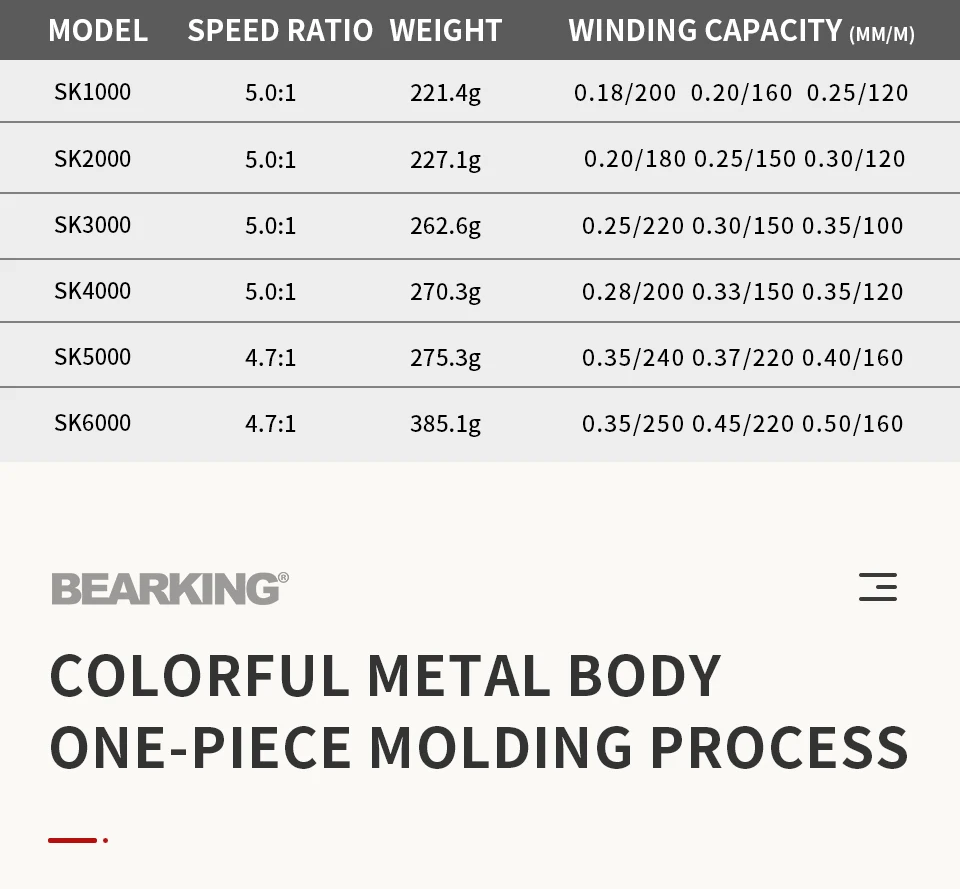 SK 1000 | Вес: 221 г | Соотношение: 5,0: 1 | Максимальное сопротивление: 5 кг | Емкость лески: 0,18 мм-200 м 0,20 мм-160 м