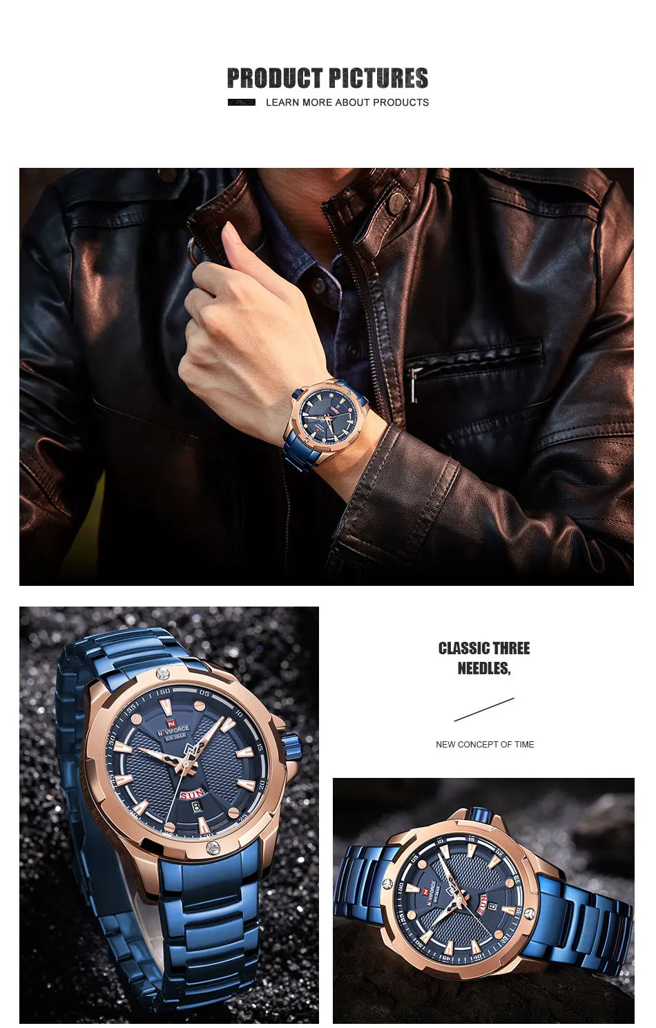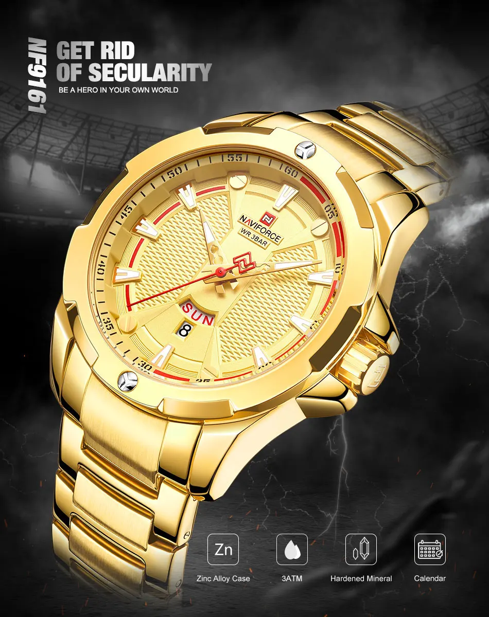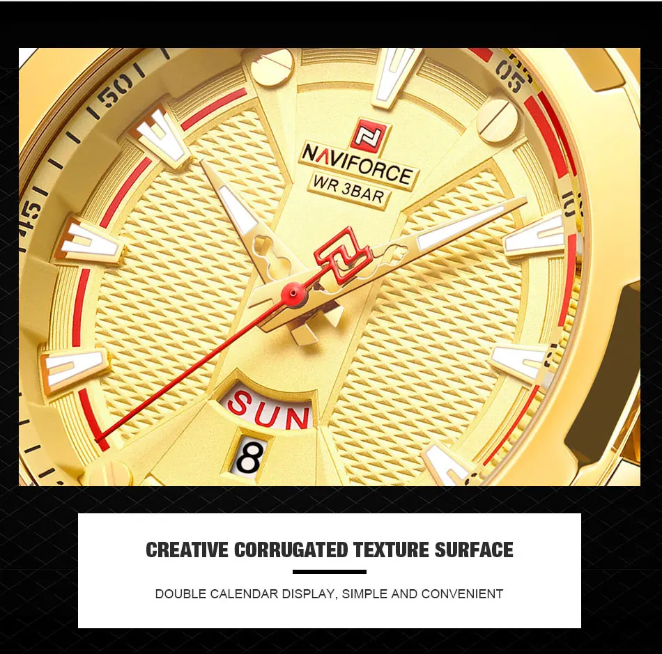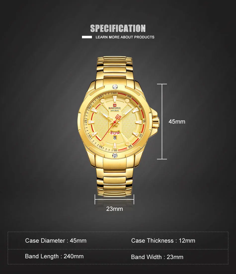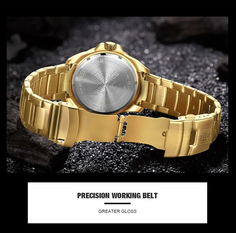Следуйте за магазином, чтобы получить эксклюзивную цену! Модель: NAVIFORCE NF9161 Механизм: кварцевый механизм Диаметр циферблата: 45 мм Чехол Толщина: 12 мм Длина ремешка: 240 мм Ширина ремешка: 23 мм Вес изделия: 155 г Особенности: Светящиеся стрелки, водонепроницаемые, дата, большой циферблат, ремешок из нержавеющей стали, модные, повседневные, подходят для улицы, военные Описание: -100% новый бренд и высокое качество; -Топ бренд класса люкс высокого качества дизайн циферблата, функция отображения даты; -Отличное качество изготовления и элегантный стиль; -3 АТМ/30 м водонепроницаемый Посылка включает в себя: Часы Naviforce-1 шт. 1 х Руководство пользователя с гарантийной картой