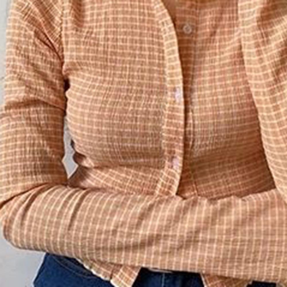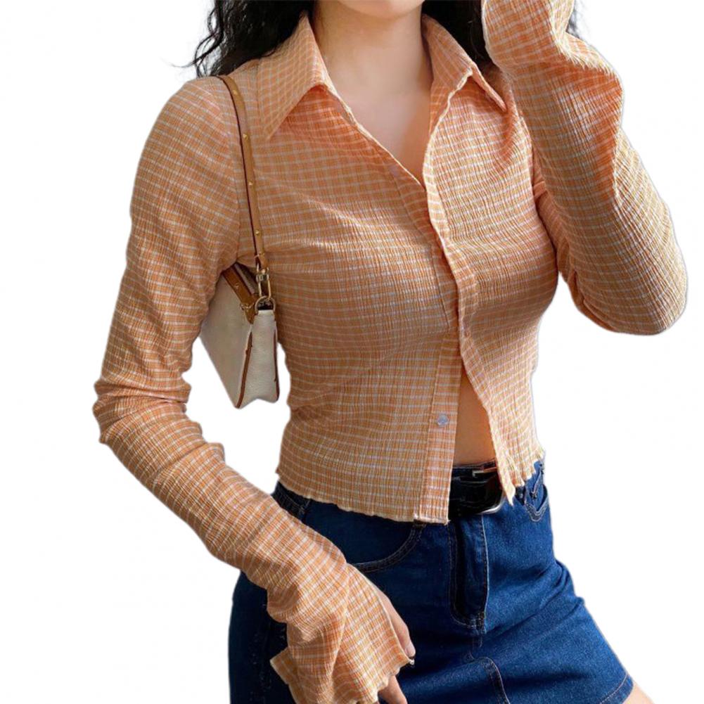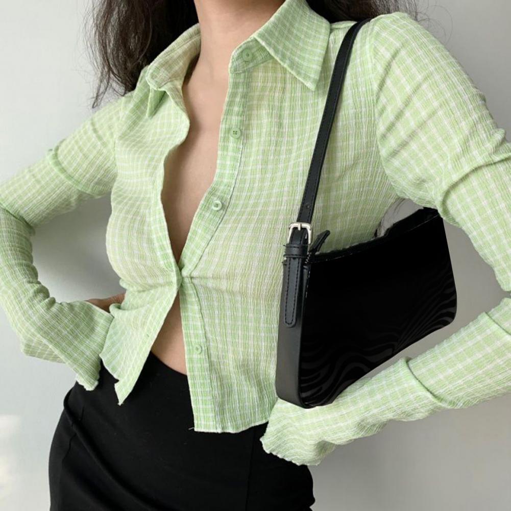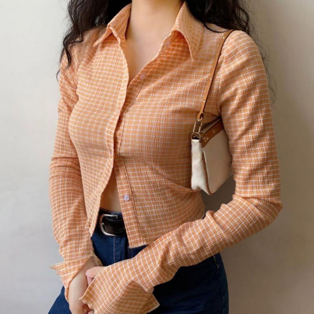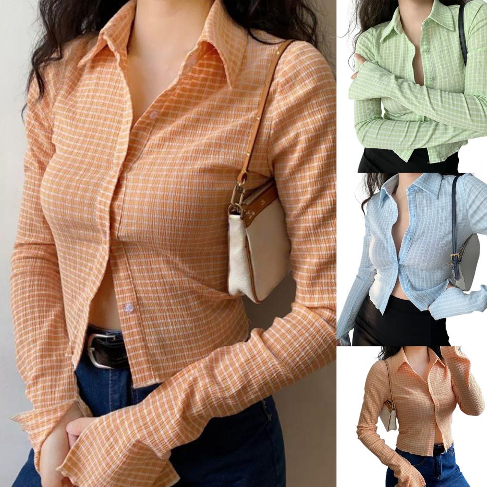 Рубашка с отворотом, тонкий винтажный женский клетчатый Топ с длинным рукавом для свиданий