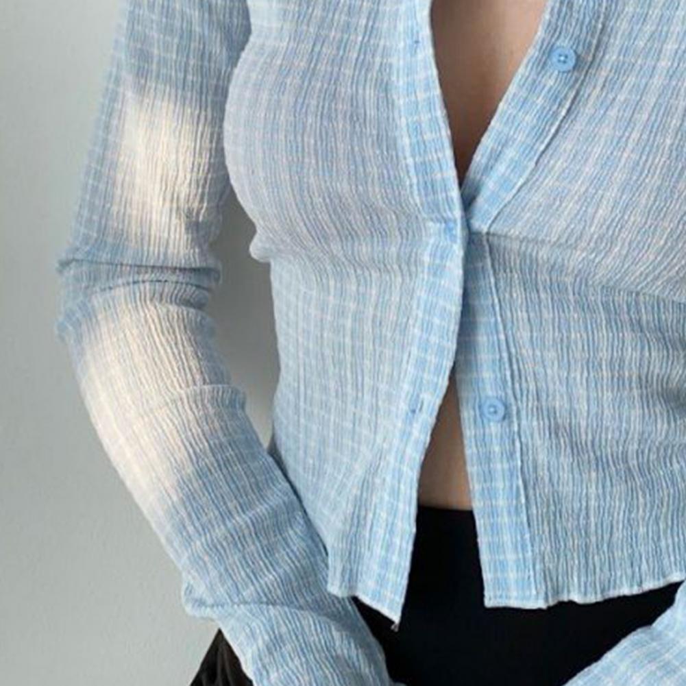 Застежка на пуговицах позволяет легко надевать и снимать эту блузку. Короткий стиль блузки подходит для подходящих брюк с высокой талией или юбки с высокой талией.
