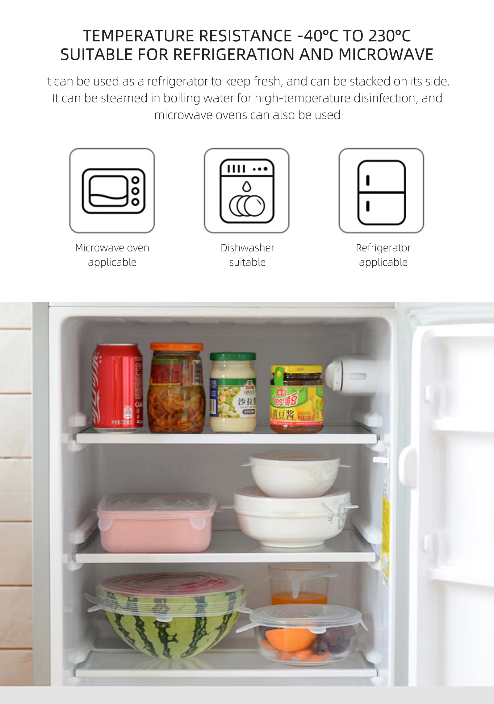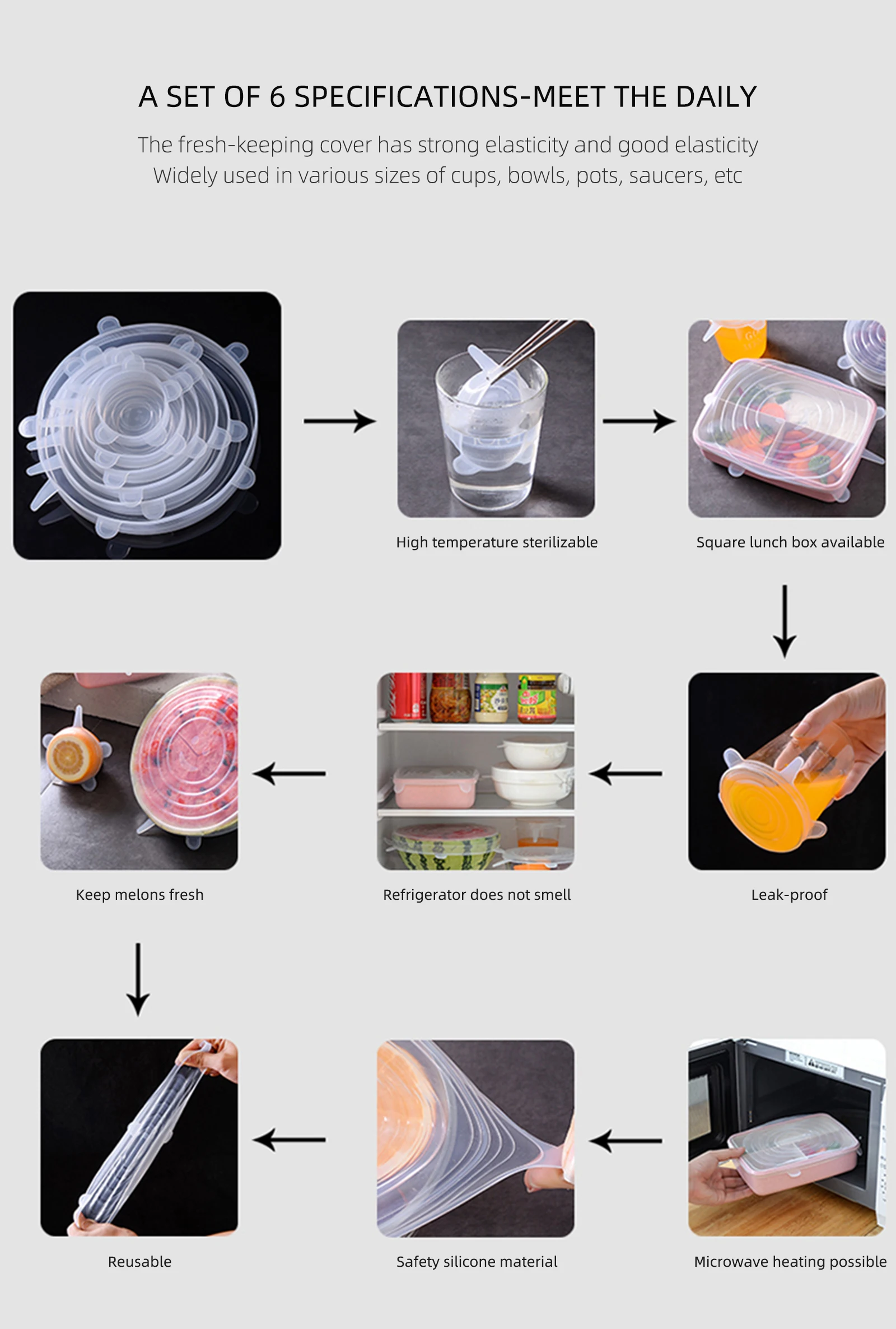 Спецификация Вес: Эластичный LIDS-120g -6 различных размеров, начиная от 6,5 см до 20,5 см. -Растягиваемость 1-2 см -Большинство продавцов eBay продают этот вариант. Эластичный LIDS-150g -6 различных размеров, начиная от 6,5 см до 21,5 см -Растягиваемость 2-3 см -Длительный срок службы-долгие годы растяжения Материал: 100% пищевой силикон, без BPA Цвет: белый/синий (по желанию) Многоразовые силиконовые Эластичные крышки Премиум, пищевой силикон, подходит от предметов из чаш и кастрюль до фруктов! Экологичная альтернатива для цепляться за пленку. Мы стремимся помочь окружающей среде, отлично выглядя в этом процессе! Каждая силиконовая крышка поставляется с легко вытягивающимися бирками, чтобы было легче вытянуть герметичное уплотнение вашей чаши, горшка или фруктов. Идеально подходит для чаш, блюд, тарелок, банок, банок и кружек. Наши Эластичные крышки-отличный способ сохранить вашу еду в безопасности и герметизации. Они соответствуют любой форме чаши, будь то круглые, квадратные, прямоугольные, шестигранные и т. Д. Изготовленные из пищевого силикона, наши Эластичные крышки безопасны для посудомоечной машины, моются, многоразовые, не деформируется и не протекает. Термостойкость: Может использоваться в духовке или в холодильнике. Наш высококачественный силикон-это тот же силикон, который используется в детских пустышках. Безопасно использовать при различных температурах. Наши натяжные крышки безопасны для посудомоечной машины, моются, многоразовые и не деформируется и не протекает. Каждая эластичная крышка имеет четыре бусины по краям для обеспечения герметичности вашего содержимого. Способ использования: растягивающаяся крышка над краем контейнера. Надавите сверху на крышку и потяните одну из вкладок, чтобы создать вакуумную и герметичную крышку. Примечание: 1. Из-за ручного измерения, пожалуйста, учитывайте разницу в 1-3 см, спасибо за понимание! 2. Из-за разницы между различными мониторами обратите внимание, что изображение может не отражать фактический цвет изделия. Посылка содержит: Силиконовые эластичные крышки * 6 шт