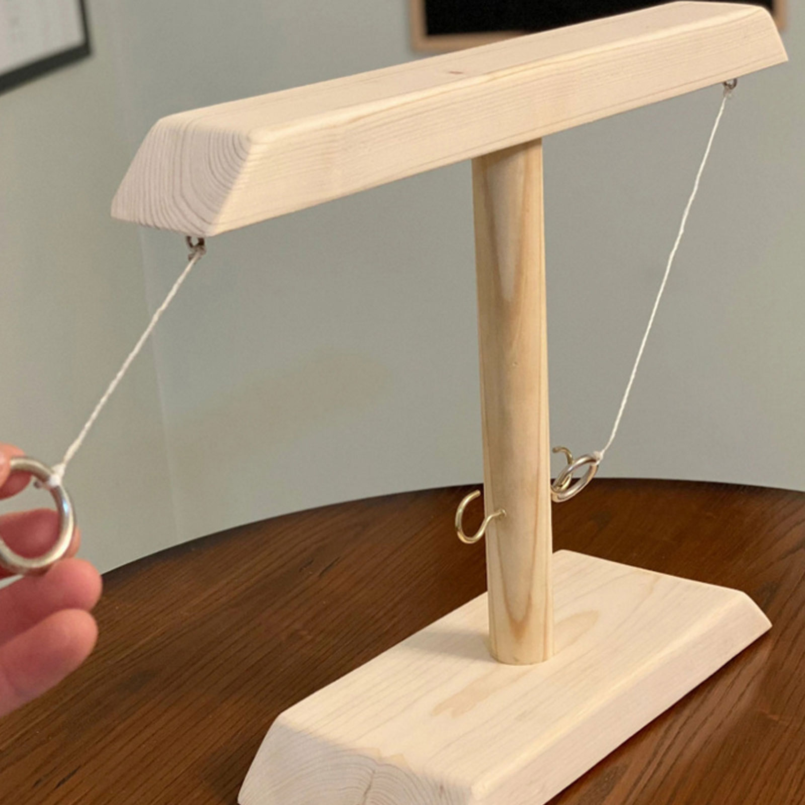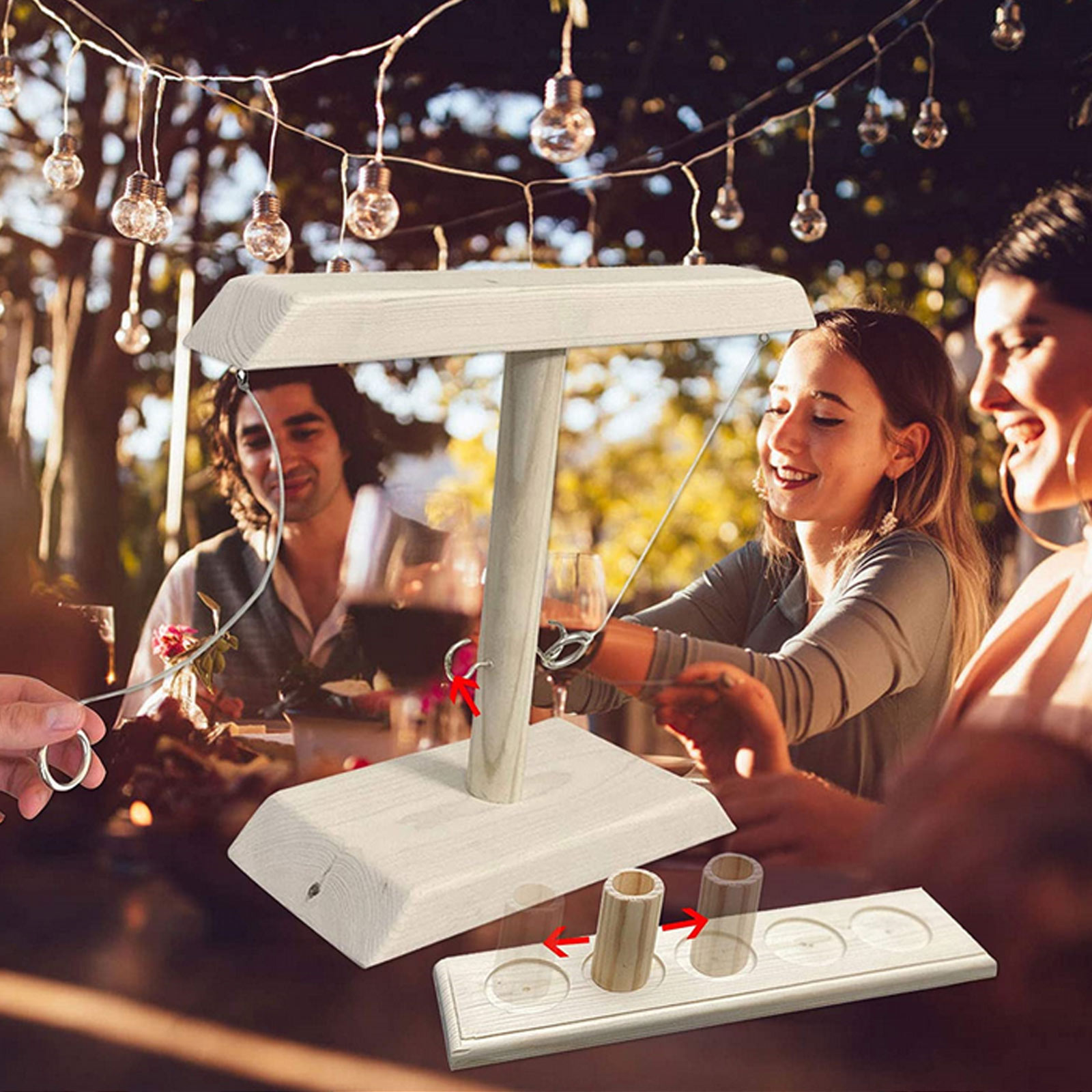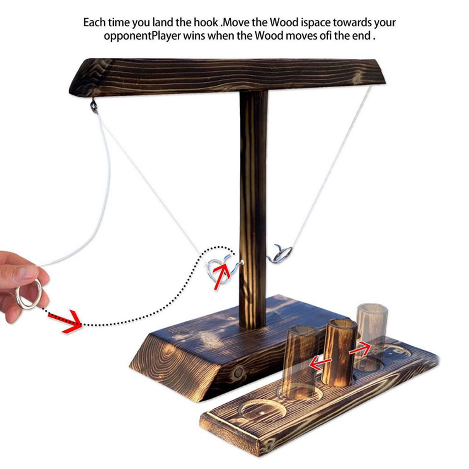 Легко играть:Поместите деревянный балл в табло, поочередно бросайте кольцо и закрепите его на крючке. Каждый раз, когда вы подключаете его успешно, перемещайте счет блок вперед. Первые, кто доберется до конца, победили.