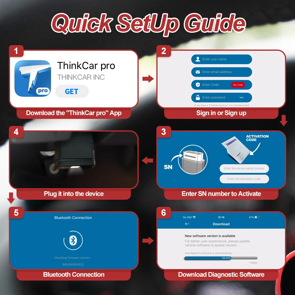 «1) загрузите и установите APK «Thinkcar diag +» в Google Play или вашем смартфоне и Зарегистрируйтесь на новую учетную запись и Войдите в систему.