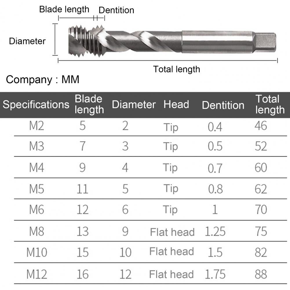 Характеристики: Спиральный рифленый Метчик: M2, M3, M4, M5, M6, спиральный заостренный Метчик: M8, M10, M12