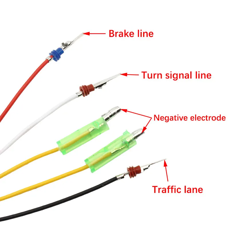 Подключение: зеленый-заземление, черный-бег, красный-тормоз, желтый-сигнал поворота