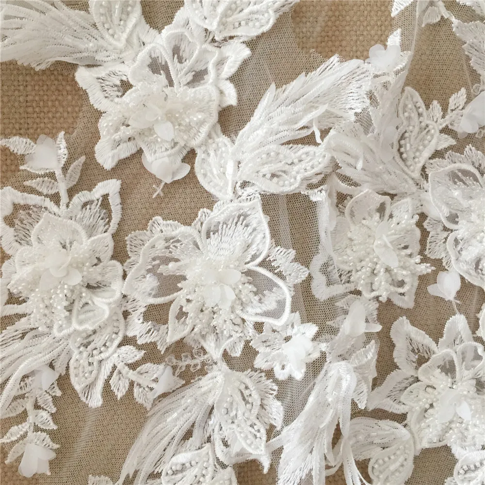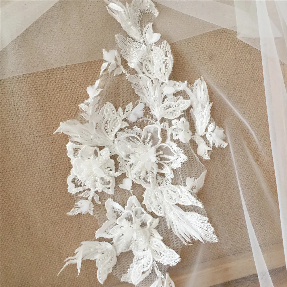 Ручная бисерная 3D Кружевная аппликация для свадебного платья, цветок и лист Кружевная аппликация, свадебное платье Кружевная аппликация, кружево для свадебной вуали, светильник цвета слоновой кости