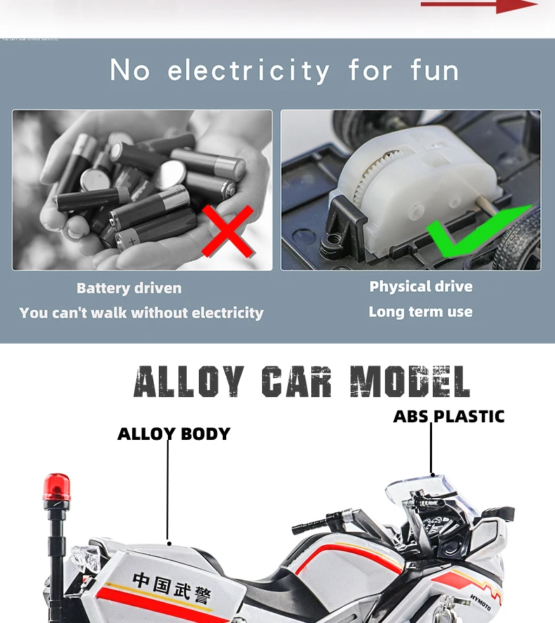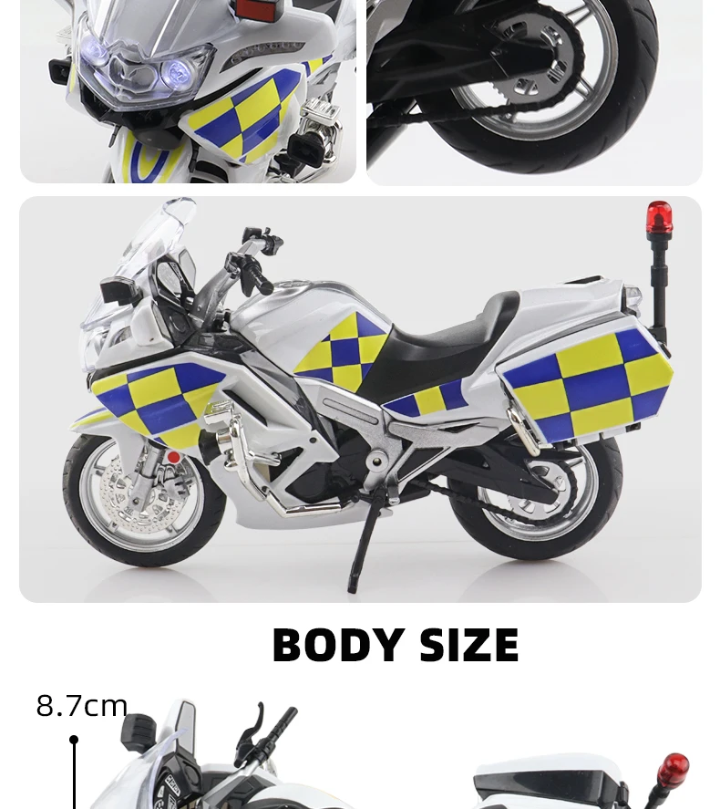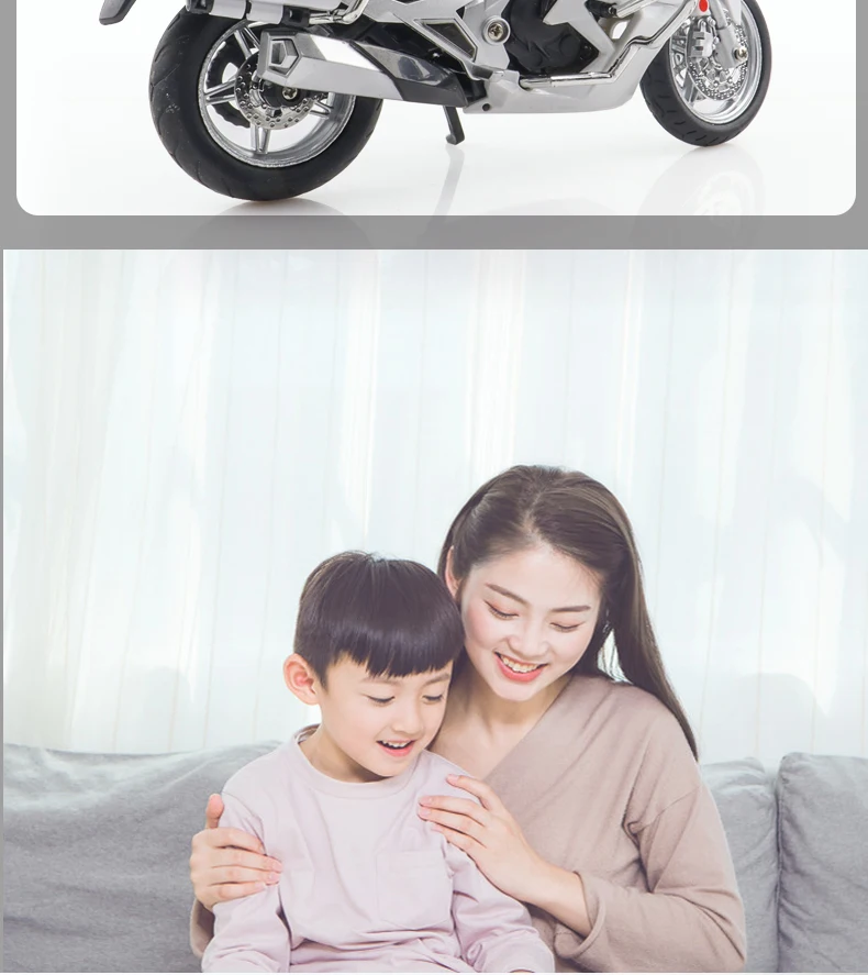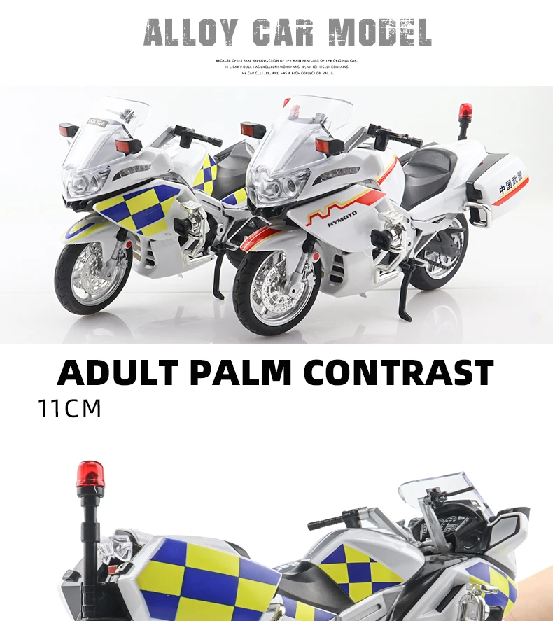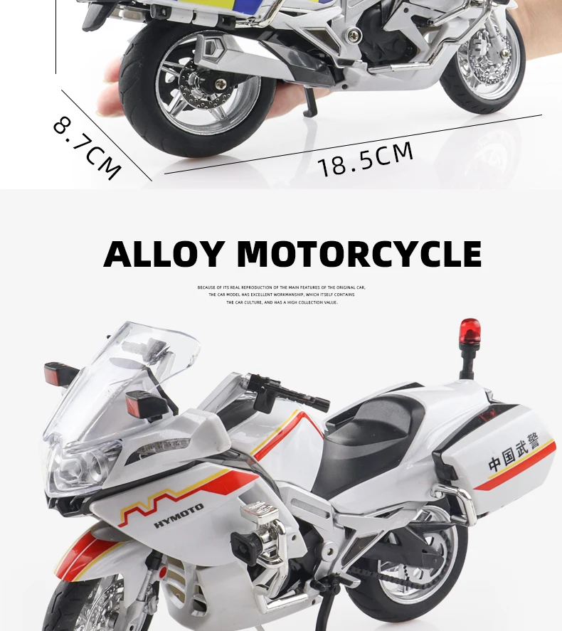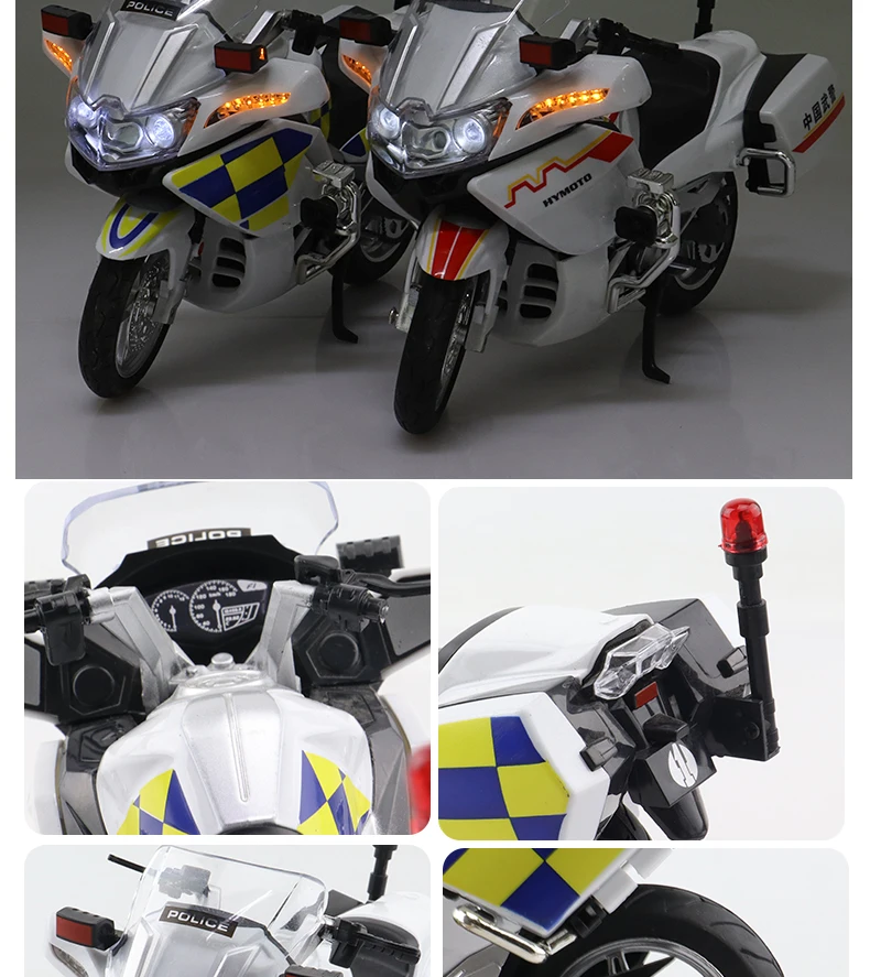 Бренд: HuaYi Размер: около 18.5cmX8.7cmX11cm Масштаб: 1:12 Материал: литой металл с пластиковыми деталями Упаковка: Полноцветная оконная коробка Функция: ● Переднее колесо и руль могут качаться из стороны в сторону ● Звук и светильник ● Подвижная подставка ● Пружинная задняя подвеска ● Колеса свободной прокатки