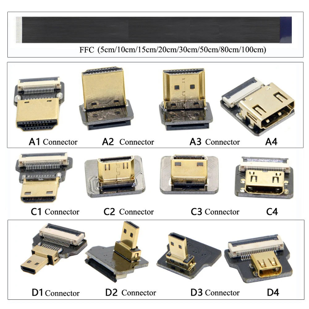 FPV микро HDMI-совместимый мини HDMI 90 градусов адаптер 5 см-100 см FPC плоский кабель HDMI шаг 20-контактный разъем