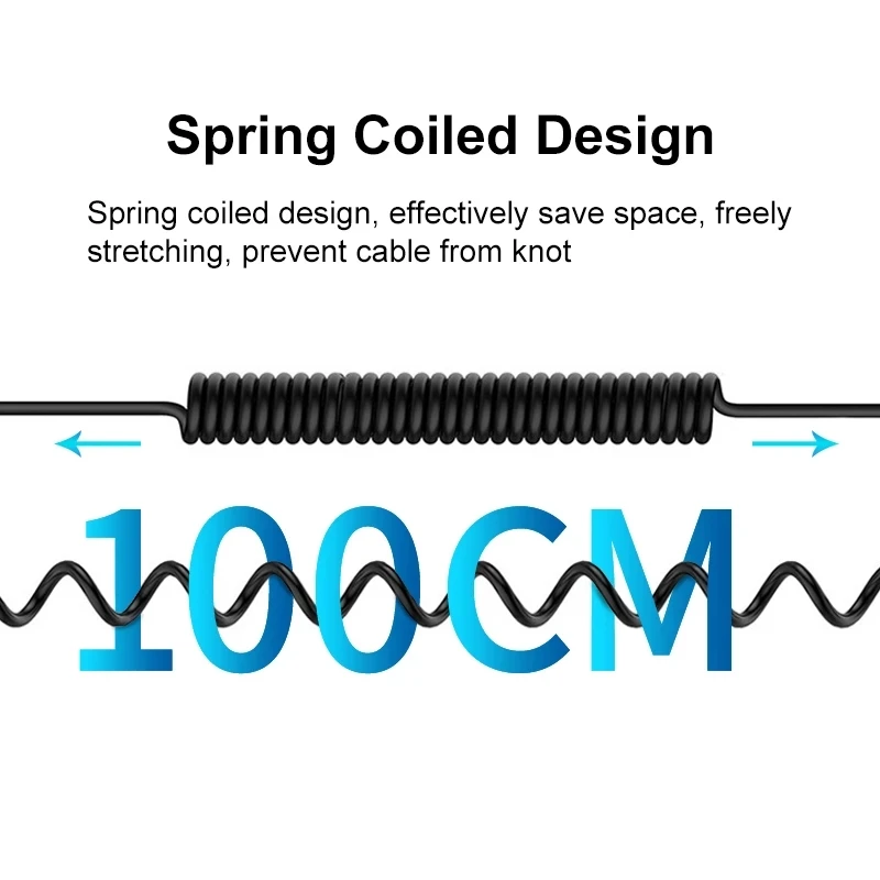 1. Изготовлен из высококачественного полиэтиленового материала для эластичности и долговечности, комфорта и сопротивления против тяги и изгибов для защиты внутреннего ядра. 2. Растягивается до 100 см пружинный дизайн, повышает гибкость, светильник и подходящую длину, легко собрать, носить с собой и использовать. 3. Небольшой размер и легко носить с собой. 4. Внешний 3,5 мм микрофон может быть подключен через аудио-адаптер для удовлетворения профессиональных студий звукозаписи потребности. 5. Идеально подходит для подключения в режиме реального времени широковещательный микрофон К смартфонам.