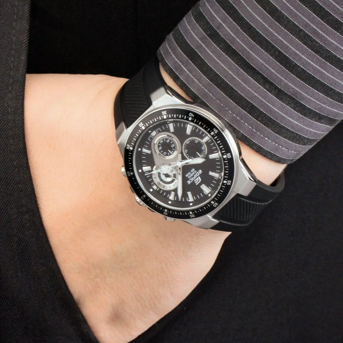 Спортивные часы из серии Edifice Chronograph для мужчин. Корпус из нерж. стали, безель с IP-покрытием, полимерный ремешок. Циферблат стилизован под карбон. Минеральное стекло. Водозащита 10АТМ. Точный кварцевый механизм с хронографом.