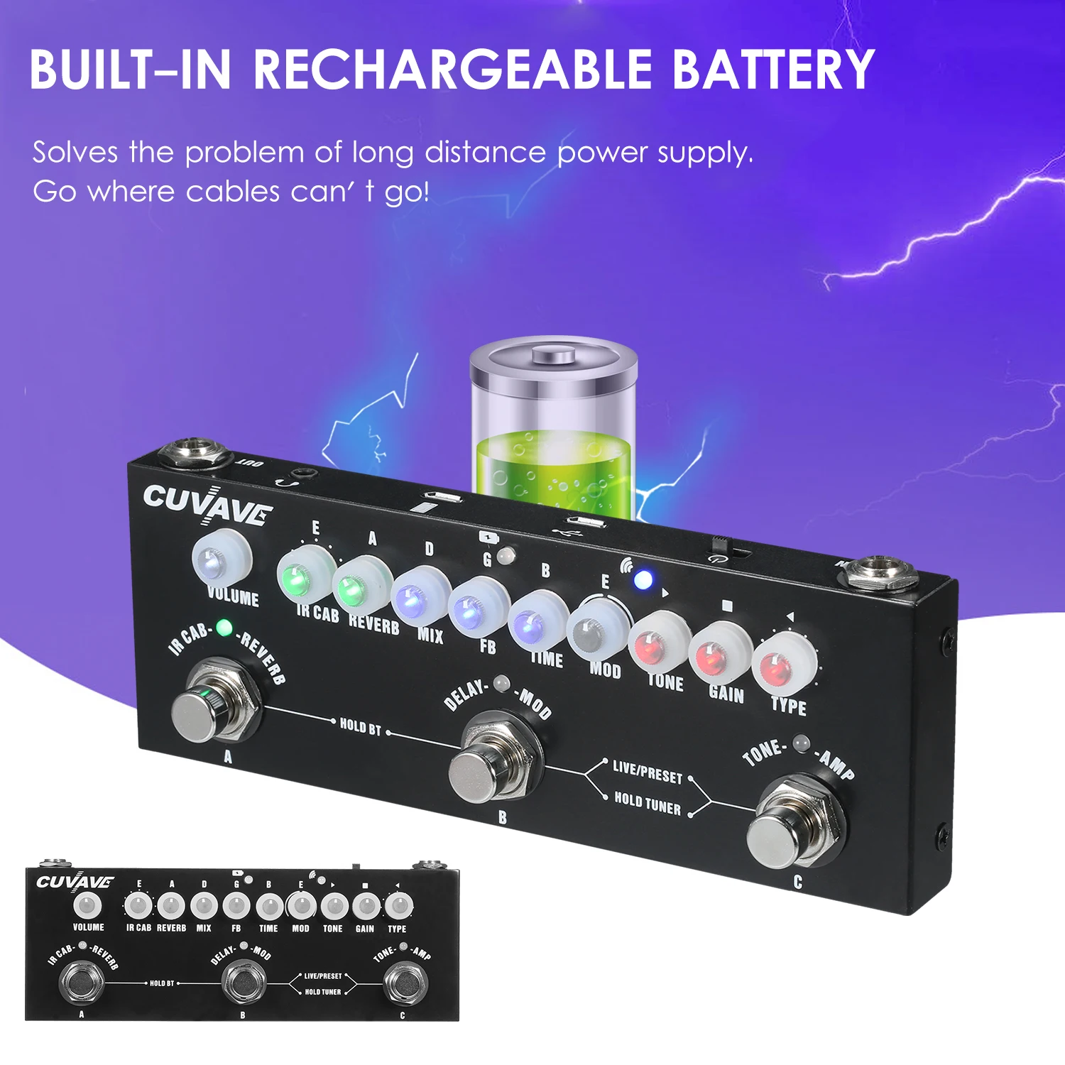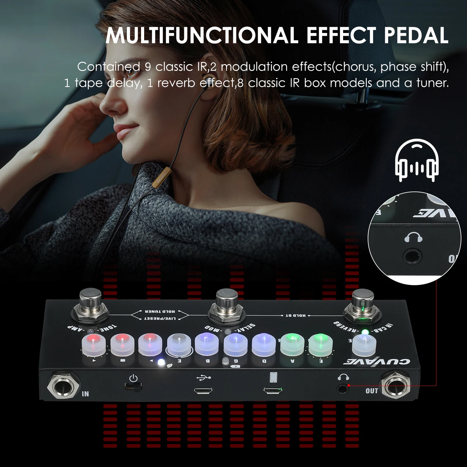 [Многофункциональная педаль эффектов] содержит 9 классических ИК, 2 модуляционных эффекта (хор, фазовый сдвиг), 1 задержку ленты, 1 эффект реверберации, 8 классических моделей ИК-боксов и тюнер.