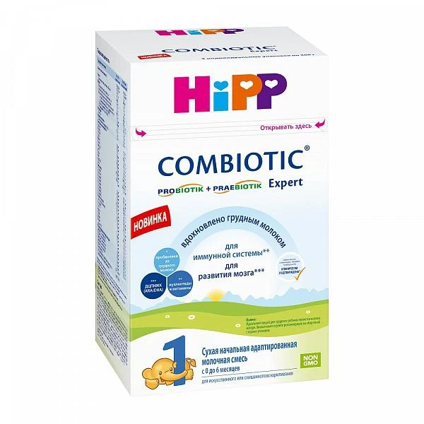 Для питания детей раннего возраста предпочтительнее грудное вскармливание. Адаптированная молочная смесь HiPP 1 Combiotic Expert может быть использована с рождения для искусственного вскармливания или в качестве дополнения к грудному молоку (смешанное вскармливание) по рекомендации педиатра. Молочная смесь HiPP 1 Combiotic Expert содержит пробиотики грудного молока – живые лактобактерии l.fermentum, выделенные из грудного молока, и пребиотические пищевые волокна (галактоолигосахариды GOS), подобные содержащимся в грудном молоке. Клинически доказано, что такое сочетание: - способствует формированию естественного иммунитета ребенка и здоровой кишечной микрофлоры; - усиливает защитные функции кишечника; - обеспечивает комфортное пищеварение (профилактика младенческих колик и запоров); - снижает риск возникновения аллергических заболеваний; - ARA/DHA - длинноцепочечные полиненасыщенные жирные кислоты (ДЦПНЖК) для оптимального развития зрения, двигательных и познавательных функций; - нуклеотиды для усиления иммунной системы, защиты от инфекций и других заболеваний; - органическое молоко, благотворно влияющее на формирование иммунитета и снижение риска возникновения аллергии. Содержание белка: 1,3г/100 мл. Сниженный белок в молочных смесях может уменьшить риск ожирения у детей, снижение белка делает смесь еще ближе к составу грудного молока.