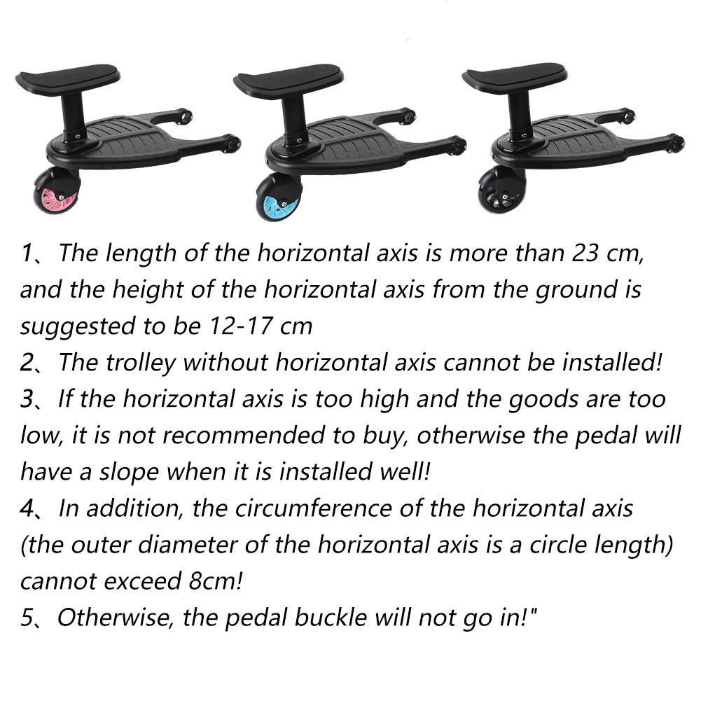 Этот скутер не подходит для всех детских колясок. Нужна детская коляска заднего колеса с горизонтальной осью и горизонтальной осью длиной более 23 см, поперечная высота от земли совет от 12 до 17 см, поперечная коляска не устанавливается. Горизонтальная ось слишком высокая или слишком низкая, не рекомендуется покупать, или установленная педаль будет иметь наклон, И периметр горизонтальной оси (длина окружности поперечного диаметра) составляет не более 8 см, в противном случае карта кнопки педали не входит.