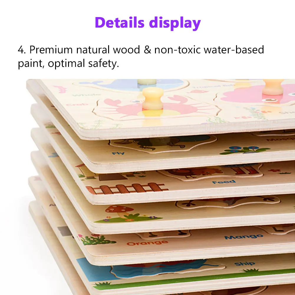 Превосходные материалы для маленьких детей. Высококачественная натуральная древесина и Нетоксичная краска на водной основе. Наши Обучающие игрушки-пазлы предназначены для оптимальной безопасности.