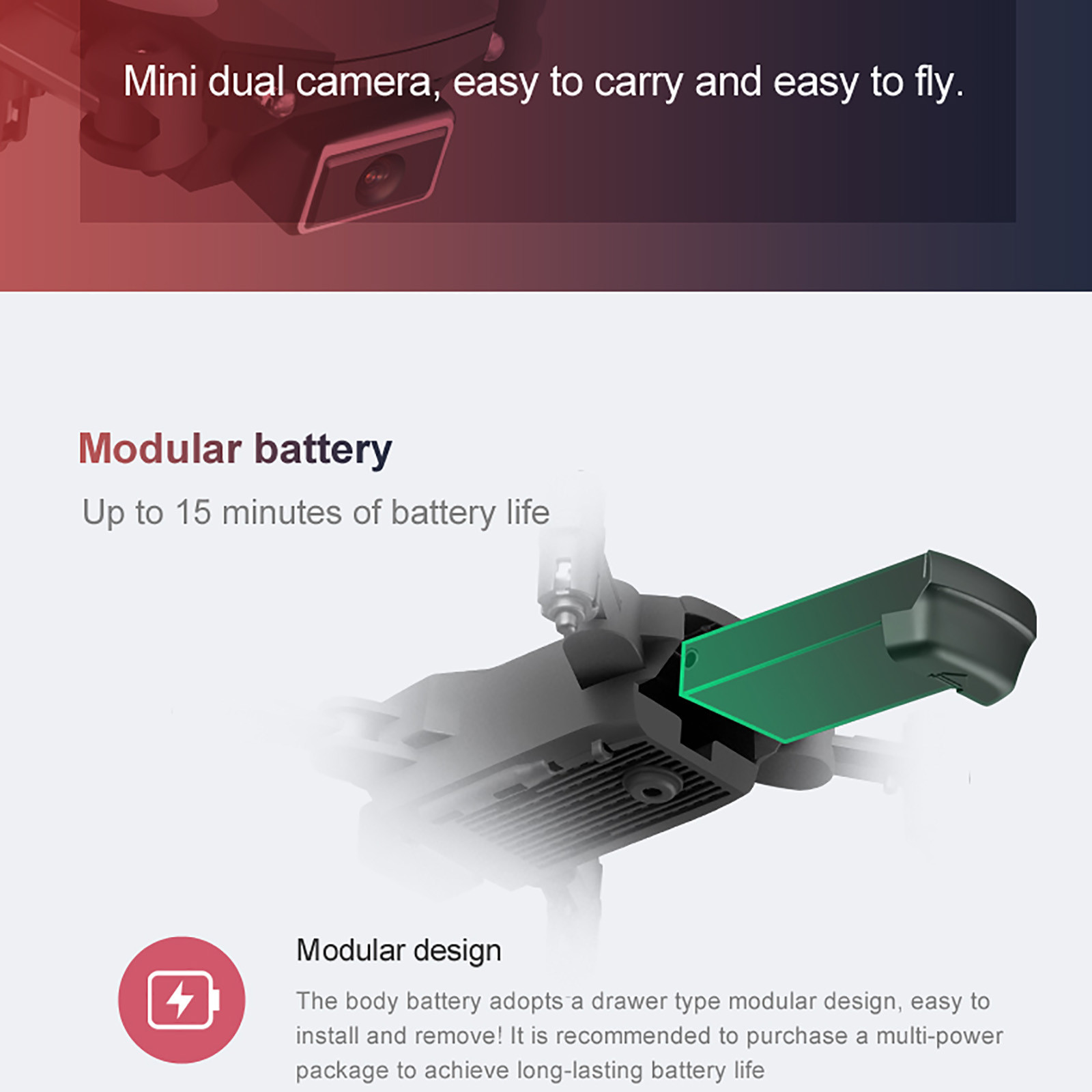 Двойной переключатель камеры, фиксированная высота Функция, складной самолет, шесть проходов с гироскопом; Один ключ, чтобы снять, Один ключ к земле, вверх и вниз, вперед и назад, левая и правая сторона летит, Поворот, Безголовый режим, кнопка рулона (с камерой можно добавить функции: жесты Фото, видео, Безголовый режим, Аварийная остановка, траектория полета, гравитация Датчик, автоматическое фото) Красивый корпус, ABS Материал/резиновый корпус краски, супер устойчивость к падению, круглый светодиодный светильник Батарея дистанционного управления: AAA Аккумулятор * 3 (автономный) Режим работы: пульт дистанционного управления Управление/Управление приложением Частота: 2,4 ГГц Гироскоп: 6 осей Канал: 4CH Способ зарядки: Универсальный USB Интерфейс Батарея Емкость: 3,7 V 650mAH Модульная батарея Время полета: около 15 минут Время зарядки: 60 минут Расстояние дистанционного управления: около 150 метров Режим камеры: FPV Объектив: встроенная камера Разрешение видео: 7020/4K dual Камера Регулировка скорости: Медленная/Средняя/быстрая Максимальная скорость движения: 10 км/ч Максимальная скорость подъема: 3 км/ч Рабочая температура: 0-40 ℃
