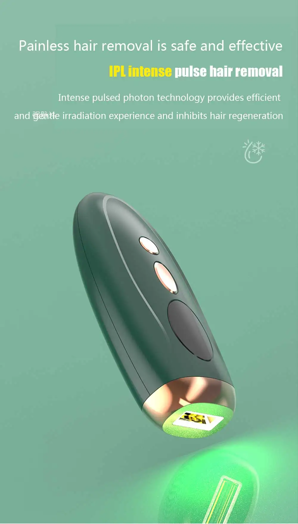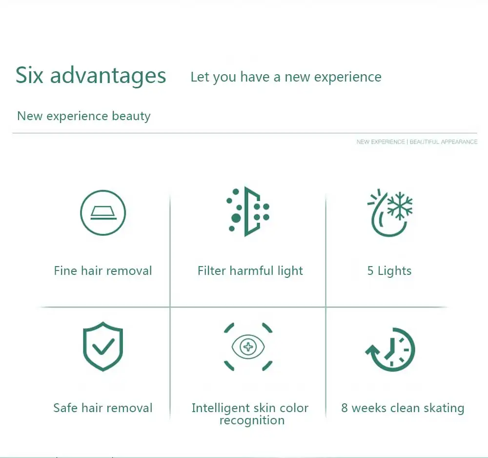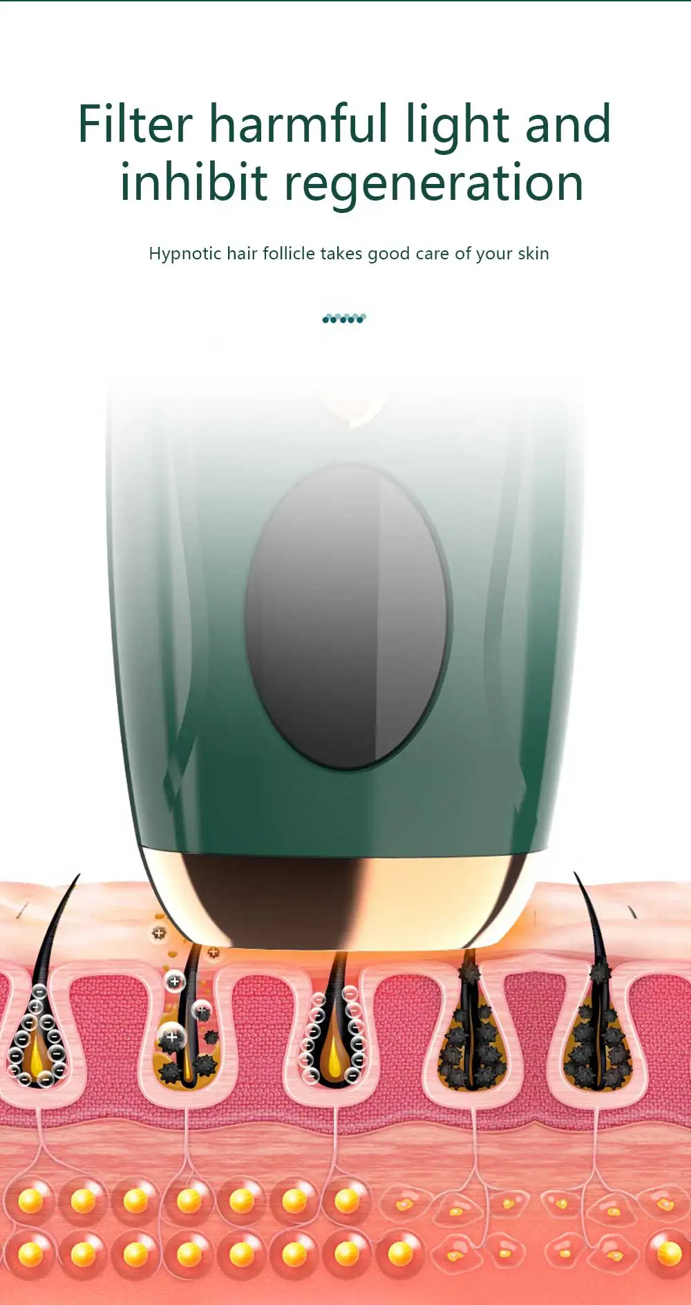 Светильник проникает в волосяные фолликулы, поглощает меланин, и измельченные волосы выпадают естественным образом, что обеспечивает длительное торможение, позволяя вам испытать новый эффект удаления волос!