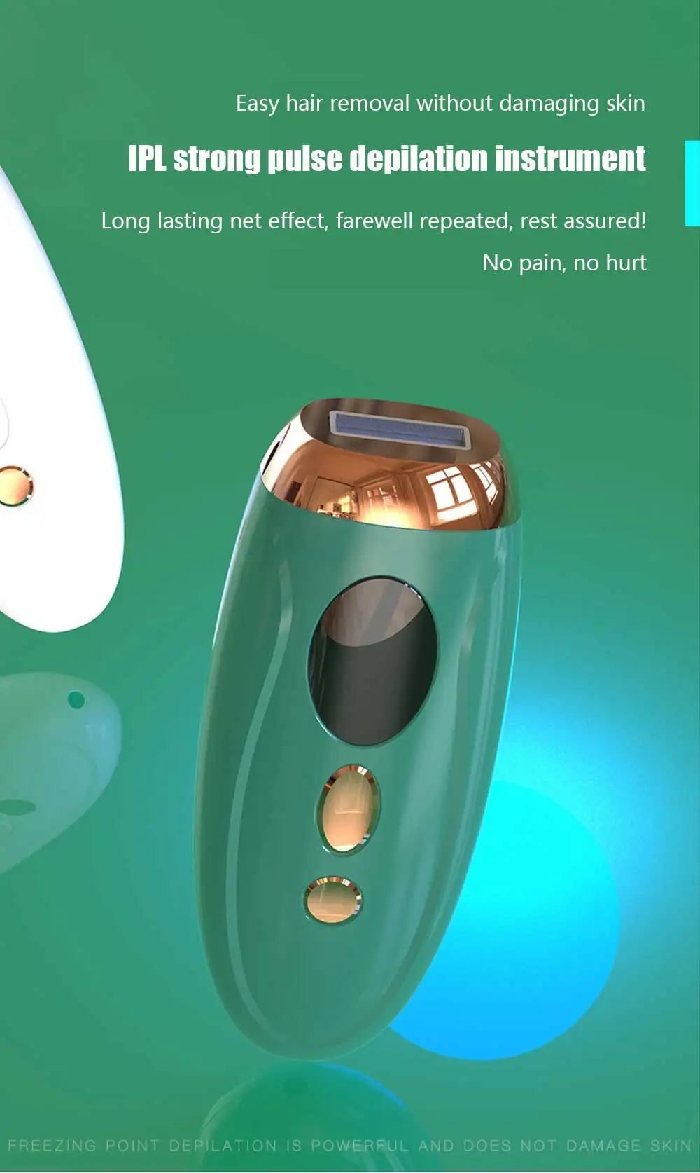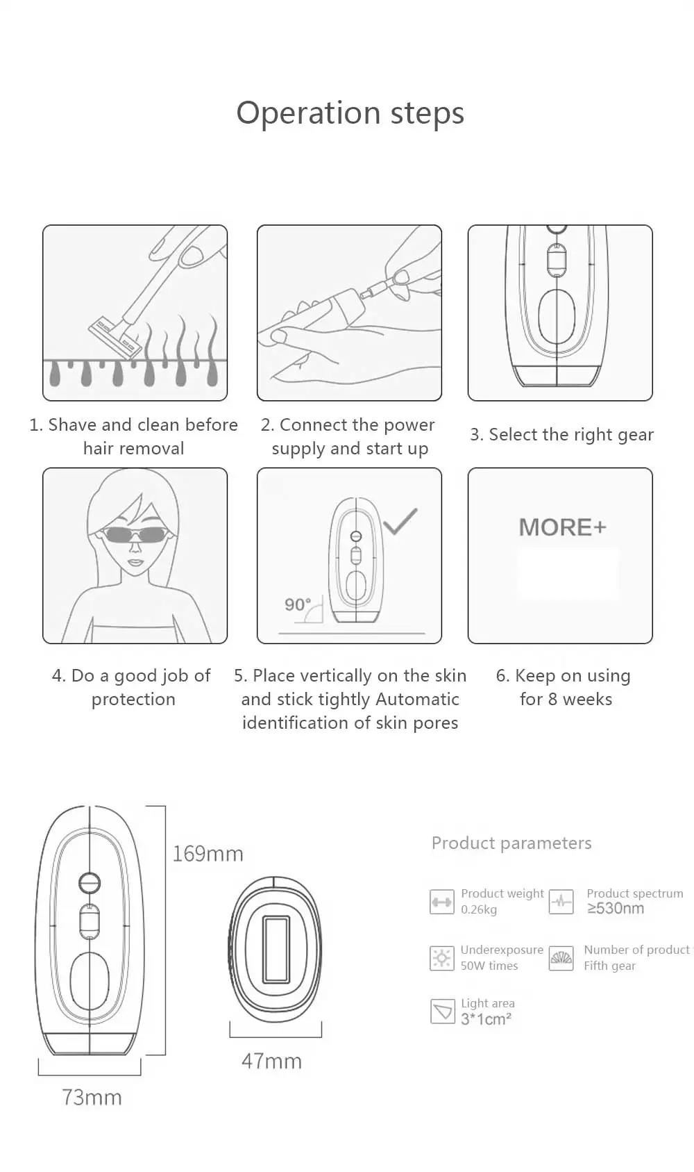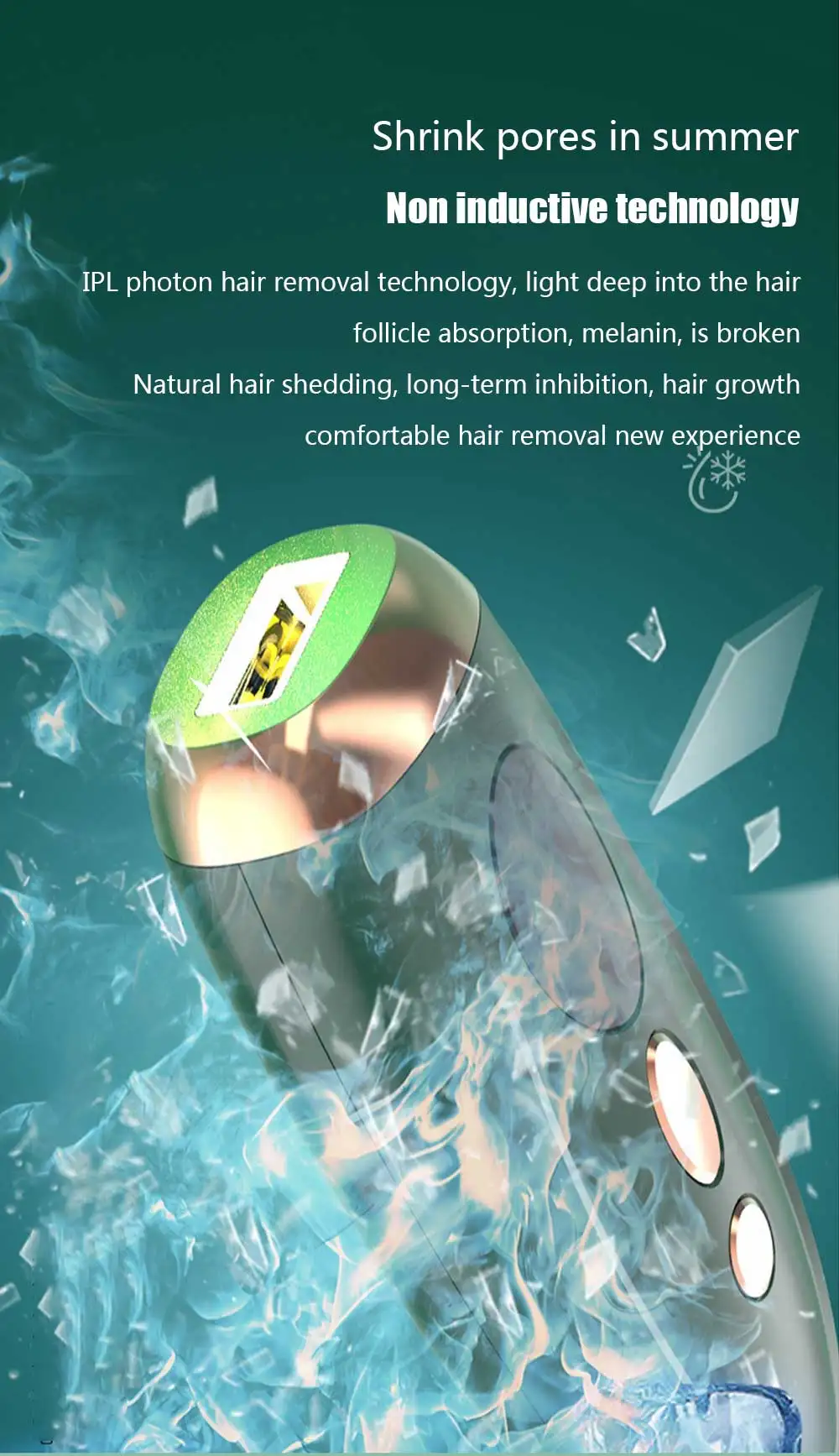 Светильник проникает в волосяные фолликулы, поглощает меланин, и измельченные волосы выпадают естественным образом, что обеспечивает длительное торможение, позволяя вам испытать новый эффект удаления волос!