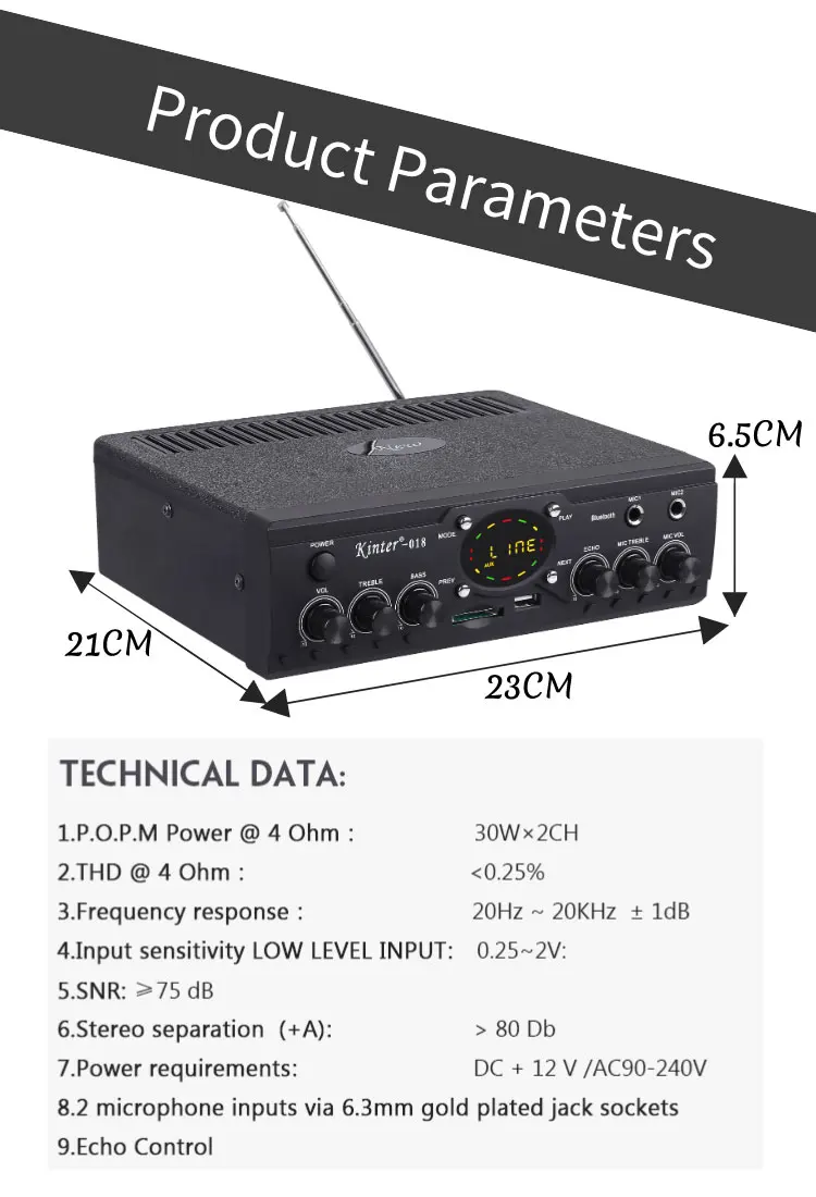 Kinter-018 усилитель использует цветовую схему черного, белого и серого цвета, с более мощным внешним видом.