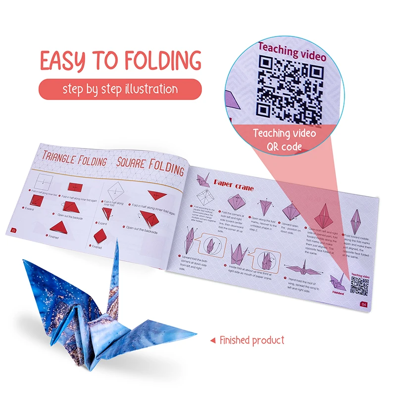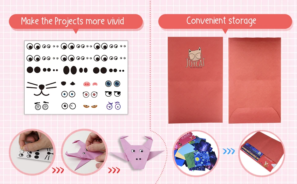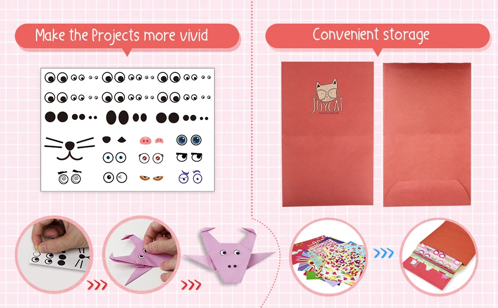 Наш продукт содержит подробную наклейку и сумку для хранения, вы можете добавить забавные наклейки к готовым моделям-чтобы сделать глаза и носы. Сумка для хранения удобна для хранения инструкции книги и неиспользованных оригами.