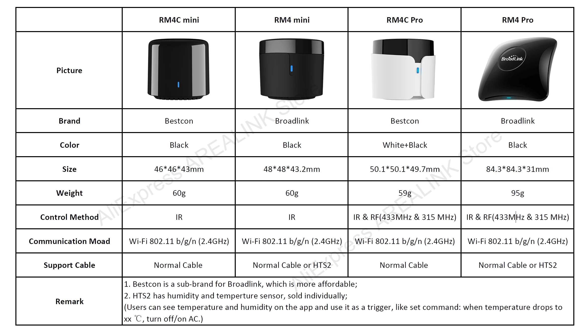 -Broadlink RM4 pro-это новейшая модель, обновление от Broadlink RM Pro +, большая разница в том, что при работе с HTS2 обнаруживается температура и влажность в помещении (Вы можете купить вместе), он может умно управлять вашим умным домашним прибором.