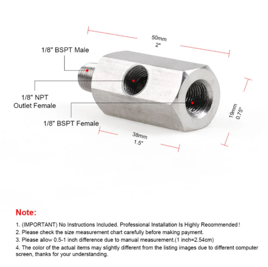 Размер Входной резьбы: 1/8 "BSPT MaleРазмер выходного отверстия: 1/8 "BSPT FemaleЦентральный кран Размер резьбы: 1/8 "NPT розеткаОбщая Длина: 2,0''Тела Длина 1,5''Посылка включает в себя: