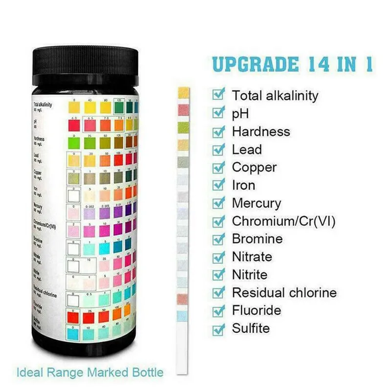 Точки пули: 1. 14 в 1 испытание воды: общая Щелочность, pH, твердость, свинец, медь, железо, ртуть, хром/Cr(VI), бром, нитрат, нитрит, остаточный хлор, фторид, сульфит и другие 14 проектов в общей сложности, вода быстрый тест, обеспечивает результаты в считанные секунды 6 в 1 тест на воду: PH, общая Щелочность, нитрит, свободный хлор, общий хлор, твердость 3 в 1 тест на воду: свободный хлор/Бром, PH, общая Щелочность 2. Здоровье: тест-полоски подходят для питьевой воды, аквариума, аквариума, бассейна и спа, промышленной воды, пруда, горячей весенней воды 3. Профессионал: высококачественный тестер воды с точной цветовой координацией и высокой чувствительностью, Используйте профессиональные тест-полоски для питьевой воды для тестирования стандартов качества воды. 4. Простота в использовании: окуните тестовую бумагу для питьевой воды в воду за 2 секунды, удерживайте ее в воздухе около 1 минуты, затем Отрегулируйте цвет бутылки, чтобы получить чтение. 5. Легко носить с собой: 50/100 штук, качество воды должно быть проверено еженедельно, тест-полоски для питьевой воды легко обрабатываются даже для начинающих. Спецификация: Название: 3/6/14-in-1 тест на качество воды Точность: 96% Количество: 50/100 шт Материал: ПЭТ Преимущество: защита от помех VC Область применения: подходит для тестирования питьевой воды, аквариумов, аквариумов, бассейнов и спа, промышленной воды, прудов, горячих источников и т. д. Метод тестирования: 1. Погрузите область реакции тест-полоски в тестовый раствор в течение 1-2 секунд, удалите тест-полосу и стряхните излишки воды на нем. 2. Через 1 минуту сравните реакционную зону тест-полоски с цветом цветовой таблицы, чтобы определить Тестовое значение тестового раствора. 3. Колориметрическое время должно контролироваться около 1 мин. Если время слишком длинное или слишком короткое, это повлияет на чтение. Упаковочный лист: 1 * бутылка тест-полоски для воды Примечание: 1. Не прикасайтесь к испытательной области ленты реагента. 2. После удаления тест-полосок, держите остальные тест-полоски герметичными и защищенными от светильник. 3. Постарайтесь, чтобы жидкость была протестирована как можно более бесцветная или цветной светильник.