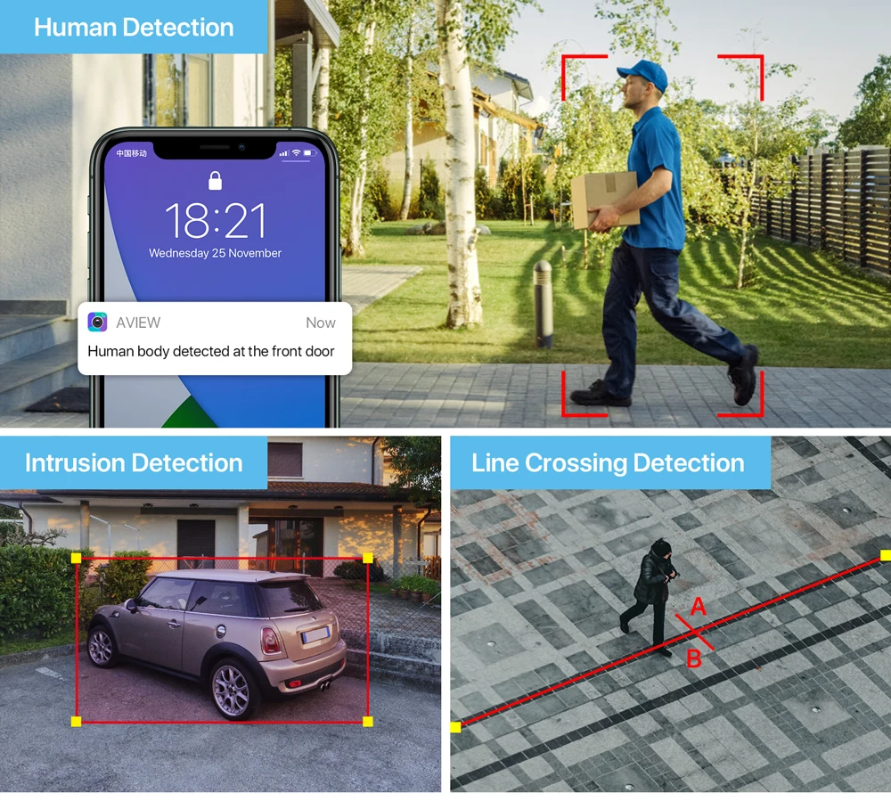 Вы можете создавать настройки обнаружения движения для камеры, включая обнаружение человеческого тела, обнаружение пересекающихся линий, обнаружение вторжений и определение конкретных регионов.