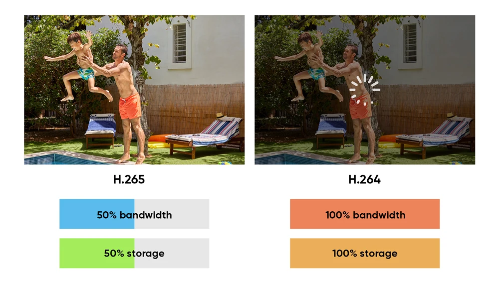 По сравнению с toH.264, H.265 экономит 50% места на жестком диске с тем же разрешением, также может поддерживать тот же уровень качества видео с 50% пропускной способностью, что и H.264.