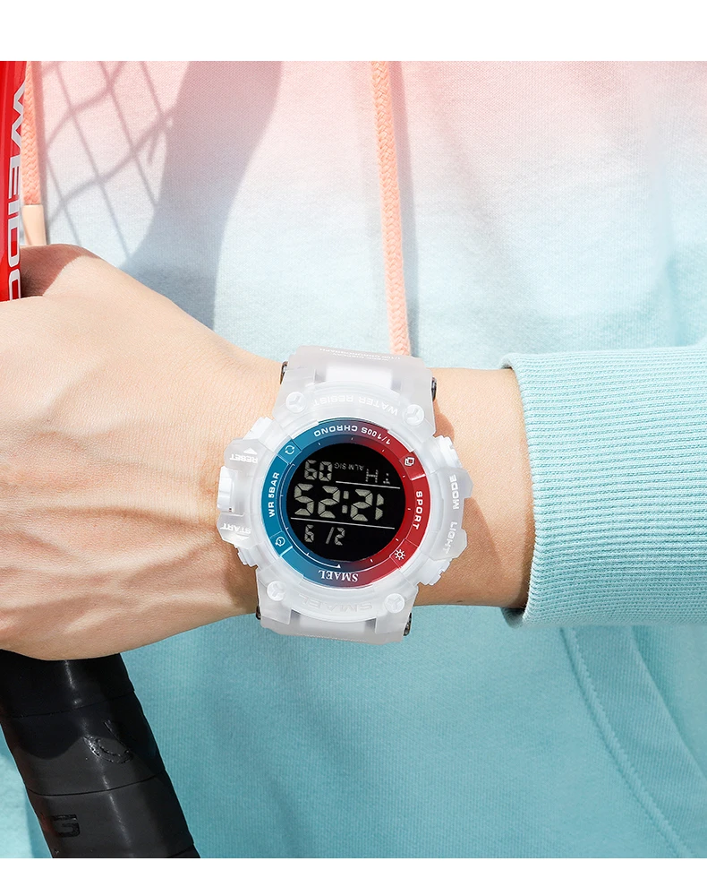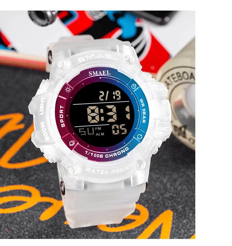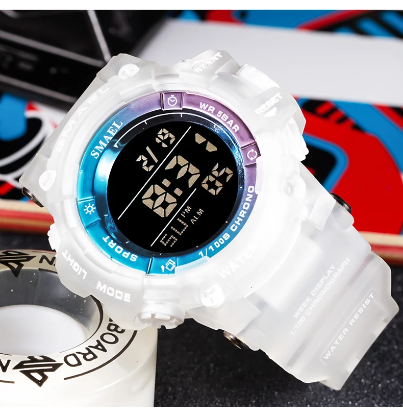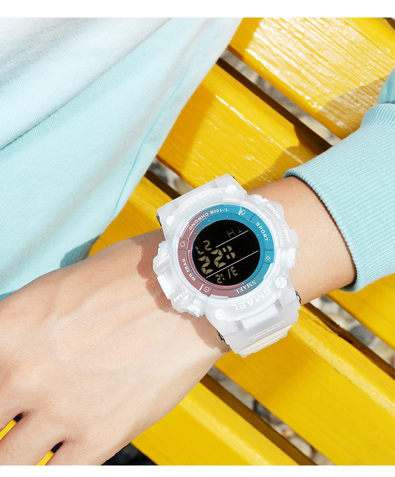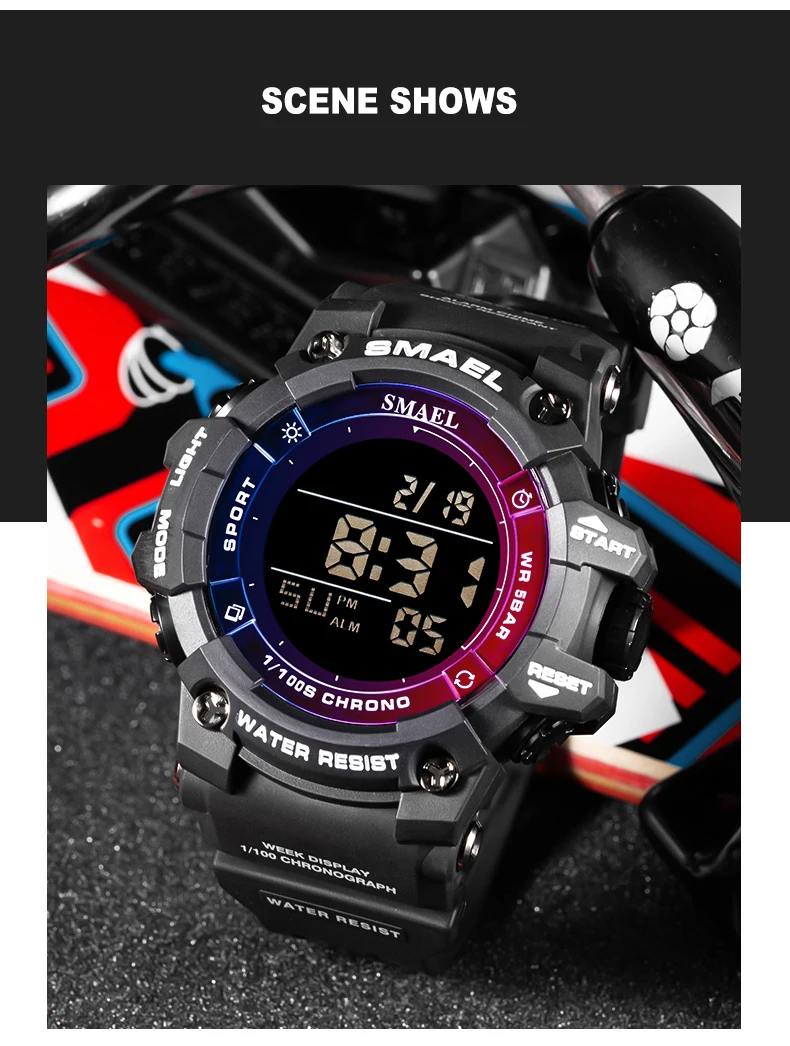 1. Бренд: SMAEL2. Функция светодиодной подсветки3. Водонепроницаемость на глубине до 50 м, можно плавать, не снимая часы.4.Тип:Мужские спортивные часы5. Механизм: оригинальная японская цифровая индикация6. 8 цветов на выбор8. Ширина ремешка: (приблизительно) 2,0 см9. Диаметр циферблата: (приблизительно) 4,8 м10. Материал ремешка: пластик ТПУ11. Материал корпуса: прочная резина + высокопрочное закаленное стекло12. Застежка: пряжка13. Показывают точное время14. Прекрасный подарок для кого-то особенногоПримечание: Мы рекомендуем вам не носить его во время плавания. Но если вы покупаетесь или ныряете, пожалуйста, не нажимайте кнопки под водой!Комплектующие в комплекте:-1 х Оригинальные часы SMAEL-1 х Инструкция по эксплуатации