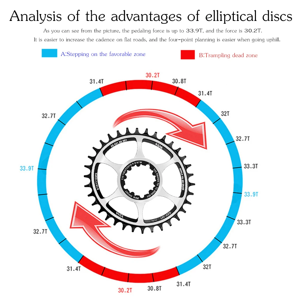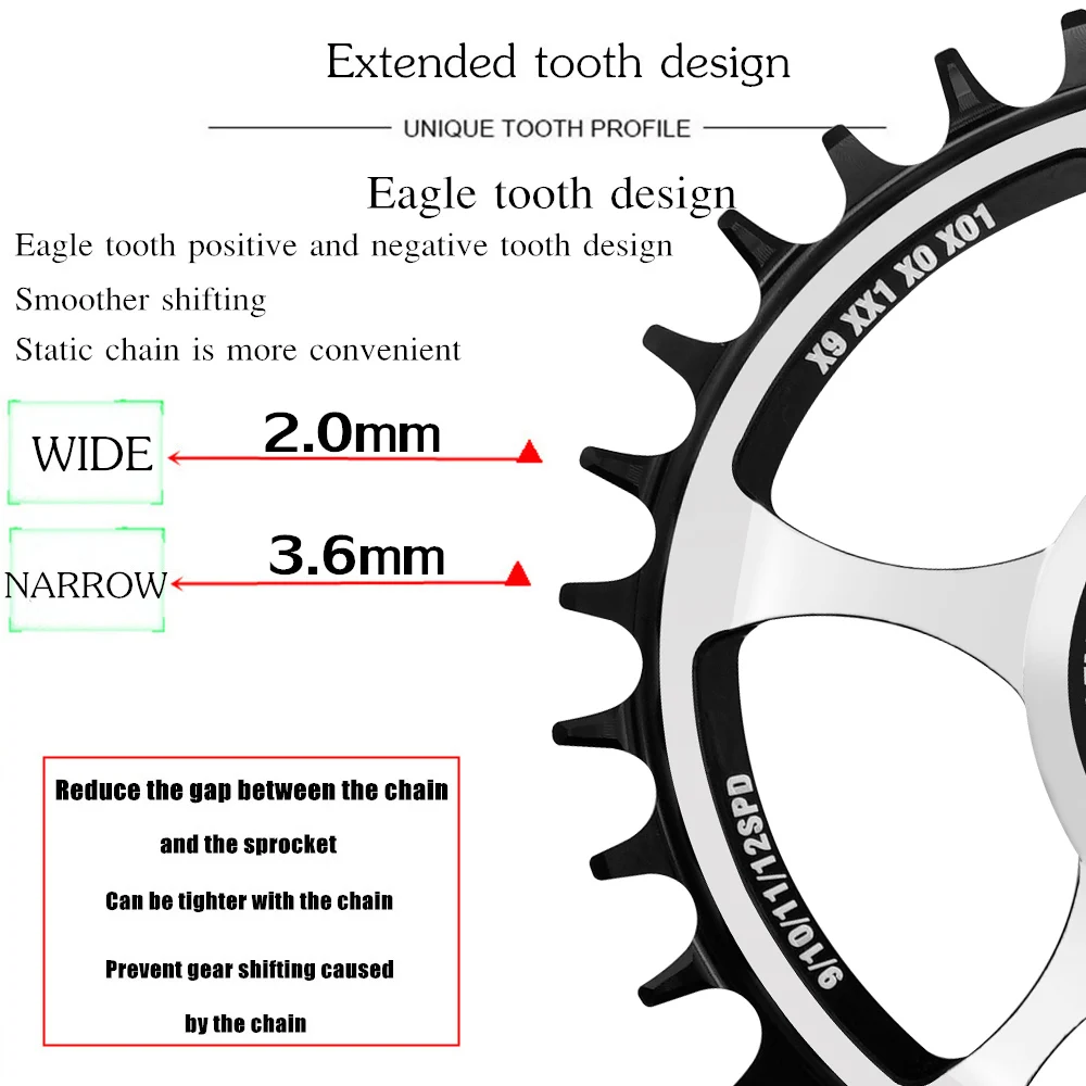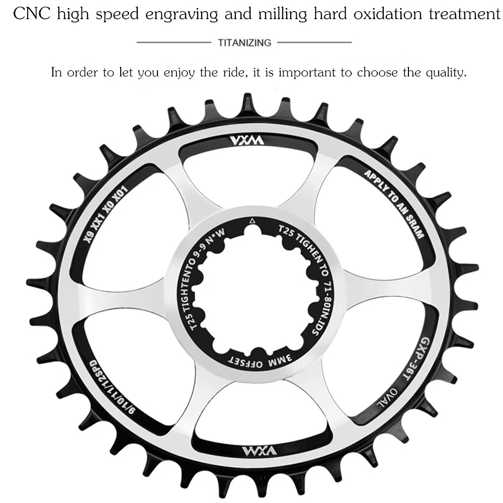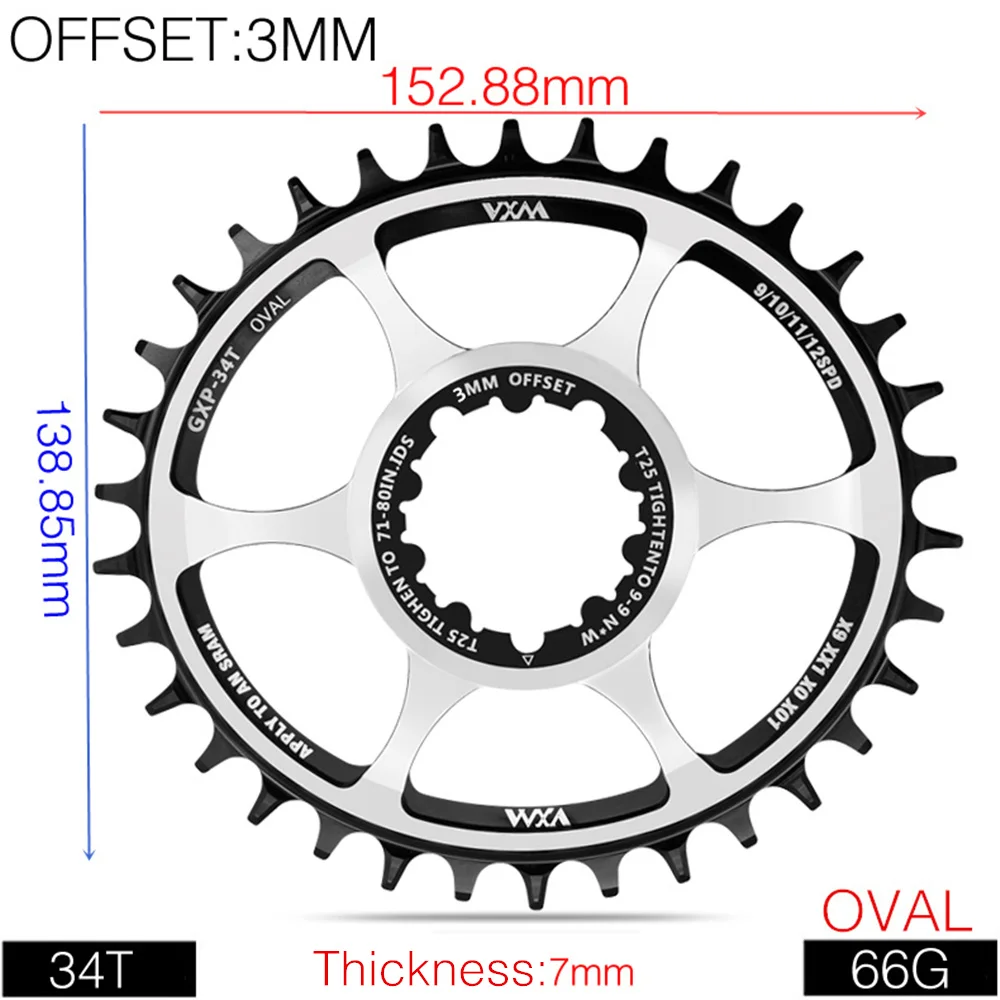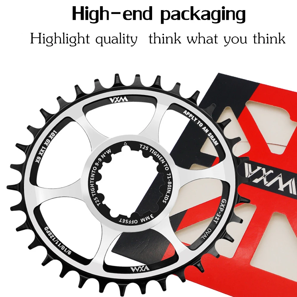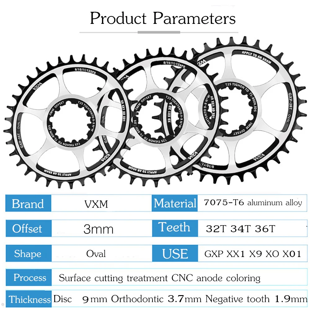Бренд: VXM Материал: 7075-T6 авиационный алюминиевый сплав Форма зубьев: овальной формы Процесс: ЧПУ высокоскоростная гравировка и фрезерование Количество зубьев: 32T/34T/36T Офсетная печать: 3 мм Толщина: диск 9 мм ортодонтический 3,7 мм отрицательный зуб 1,9 мм Расширенный дизайн зуба Уникальная форма зуба предотвращает поломку цепи