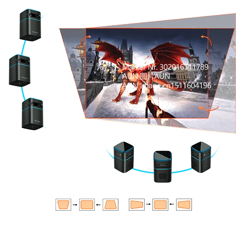 При проектировании под углом вверх изображение будет искажено в трапеции вместо прямоугольной, и Ubeamer 1 Pro делает это автоматически.